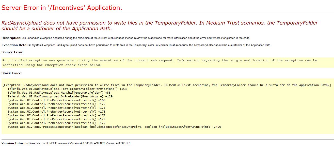 In my ASP.NET 4.0 Web Forms application, I'm using AsyncUpload for just one thing: To allow my client to send a file to me via e-mail. The functionality works perfectly fine in Visual Studio on my development machine but I'm getting an error (see screenshot) when it's deployed onto the client's server. The problem appears to revolve around the temporary file that needs to be created by the control. To solve this I first tried this on the client's server: