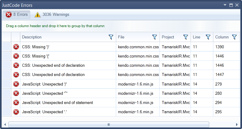 I've attached a screen shot of errors I always get when I add KendoUI to my MVC project. I'm assuming that it's not really an error, but just a formatting rule that you haven't gotten to yet.