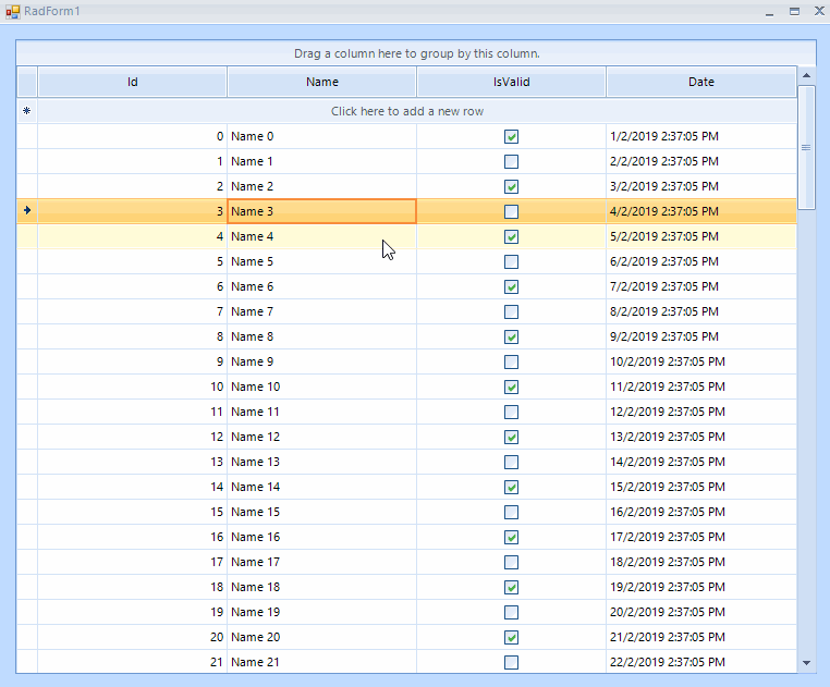 Private Sub gvTimesheet_CellValidating(ByVal sender As Object, ByVal e As Telerik.WinControls.UI.CellValidatingEventArgs) Handles gvTimesheet.CellValidating If e IsNot Nothing AndAlso e.Value IsNot Nothing Then Dim column As GridViewDataColumn = TryCast(e.Column, GridViewDataColumn) If TypeOf e.Row Is GridViewDataRowInfo AndAlso column IsNot Nothing AndAlso column.Index >= 5 Then Dim AbsenceOrIllnessMatch As Match = Regex.Match(DirectCast(e.Value, String), "[" & AbsenceString.ToLower & AbsenceString.ToUpper & SicknessString.ToLower & SicknessString.ToUpper & "]{1}\d+") If DirectCast(e.Value, String) <> "" AndAlso Not IsNumeric(DirectCast(e.Value, String)) AndAlso Not AbsenceOrIllnessMatch.Success Then e.Cancel = True DirectCast(e.Row, GridViewDataRowInfo).ErrorText = sa("The hours-worked values can only be numeric, with optional letters {0} or {1} preceding the numeric part to indicate absence hours or illness hours respectively.", AbsenceString, SicknessString) Else DirectCast(e.Row, GridViewDataRowInfo).ErrorText = String.Empty End If End If End IfEnd Sub