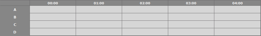 The left-most column has resources lettered A-G on a given day and top-most row shows the hours of the day. Group events for adjacent resources are show as one singular event (Ex: "In Russia" for resources A-D on Monday 8/29)