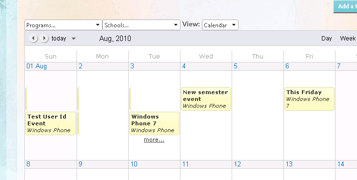 //map to appointment objectsforeach (DataRow row in events.Tables[0].Rows){ DateTime startDate = (DateTime)row["Event_StartDate"]; DateTime endDate = (DateTime)row["Event_EndDate"]; if (startDate <= endDate) { AppointmentData apt = new AppointmentData(); apt.Start = startDate; apt.End = endDate; //apt.Attributes.Add("ProgramName", row["ProgramName"].ToString()); apt.Description = row["ProgramName"].ToString(); apt.Subject = "<b>" + row["Event_Title"].ToString() + "</b><br><i>" + row["ProgramName"].ToString() + "</i>"; //apt.Description = row["Event_Description"].ToString(); apt.ID = row["EventId"].ToString(); if (!addedAppts.Contains(apt.ID.ToString())) { appts.Add(apt); addedAppts.Add(apt.ID.ToString()); } }}
