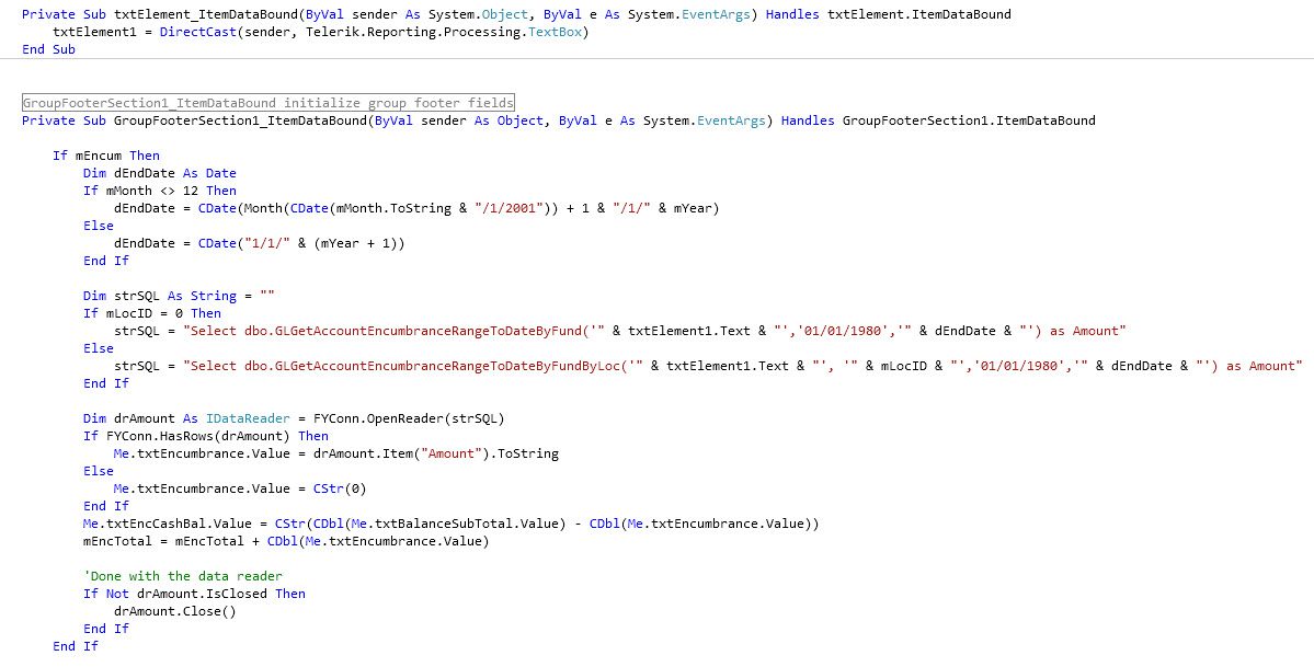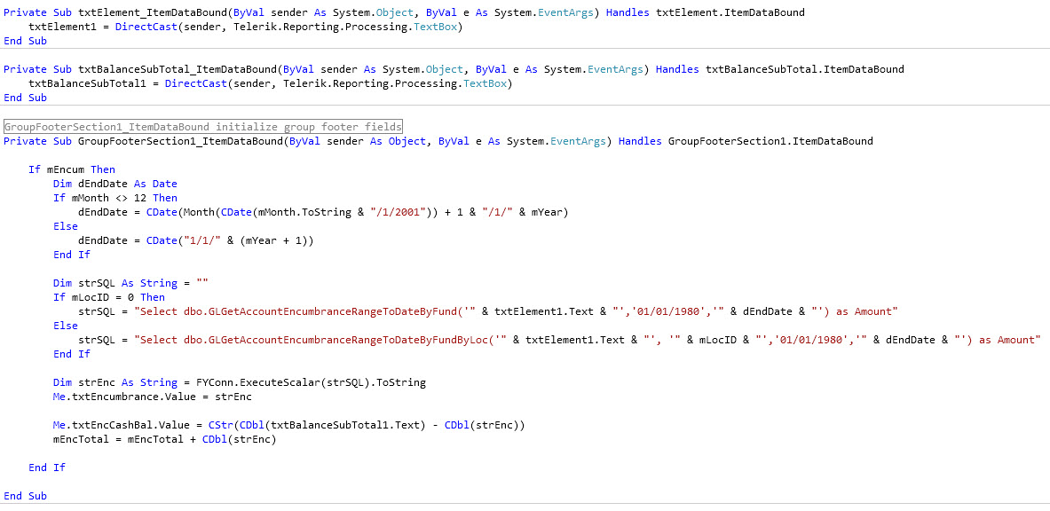 I read the "Understanding Events" article and have been researching different posts on this subject and I'm still a little confused. I want to use the runtime value of txtElement in a query to return an amount. I then want to set the value of txtEncumbrance to the amount that is returned.