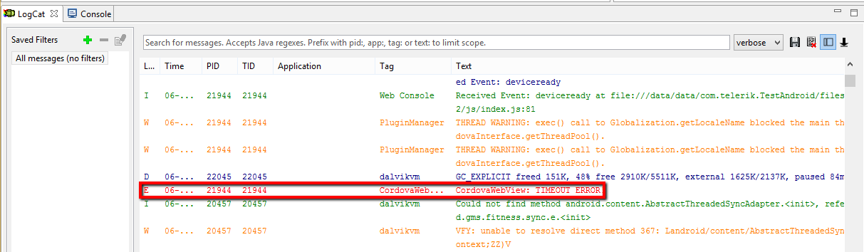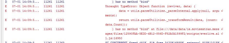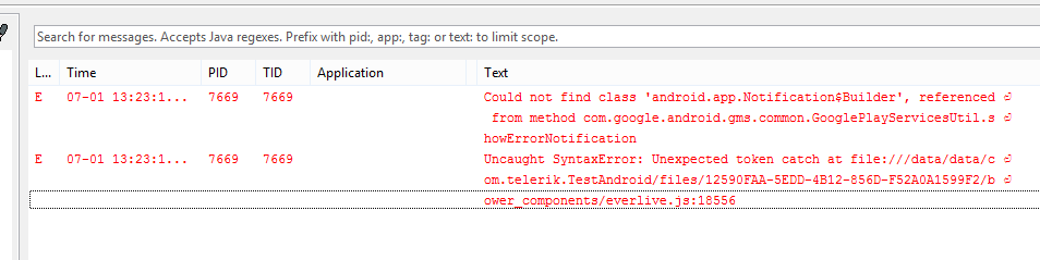 I got the Android Device Monitor working. This reports an error in everlive.js at line 18556, I assume because "catch" is a reserved word.