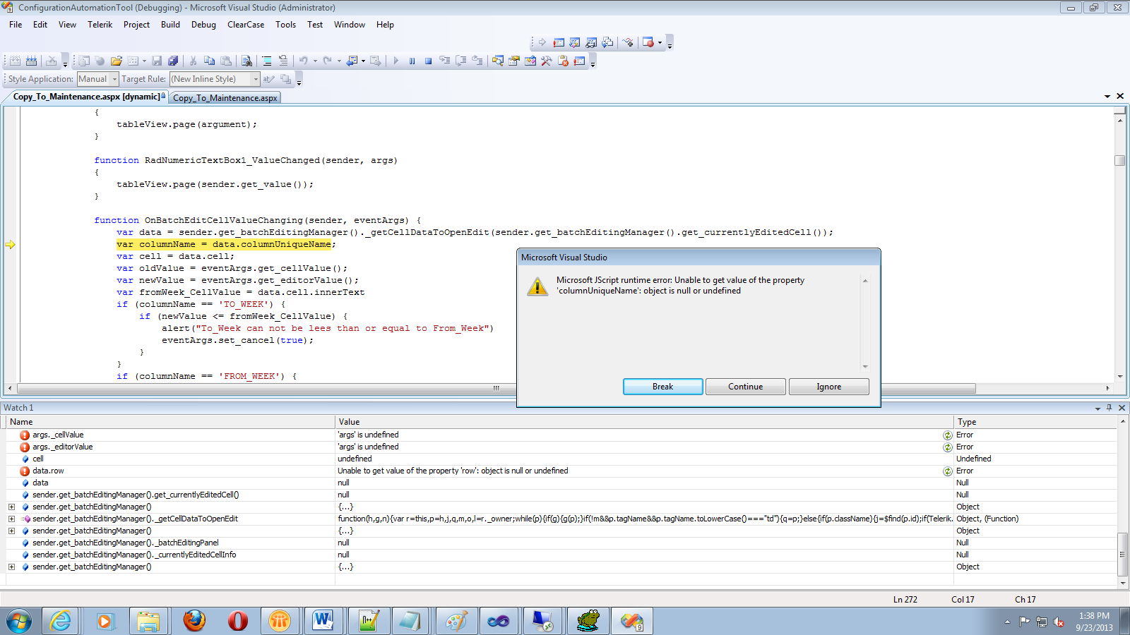 I try your codes, but I receive error "Microsoft JScript runtime error: Unable to get value of the property 'columnUniqueName': object is null or undefined". Please refer to the png file. My codes is as follows: