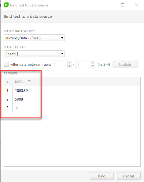 You can apply additional formatting to the cell, like currency sign, decimal numbers and a visual separator. This additional formatting is not actually part of the cell content, which Test Studio uses in the data binding. You can see which values will be used, when you initially bind the test to the data source (see dataBindingPreview.png).