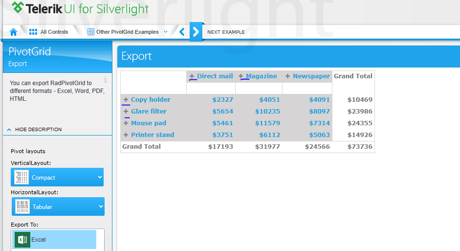 the grid. The GenerateExport() method in RadPivotGrid returns PivotExportModel which contains all