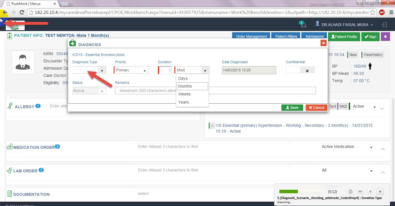 Yes, In that 9 mins video at 02.25 mins the First Iteration Starts and when the first iteration goes I am typing "WOR" in the Diagnosis Type and the value Working is Selected From the dropdown Same is done in the field which is after Duration field (ie.,Duration Type)