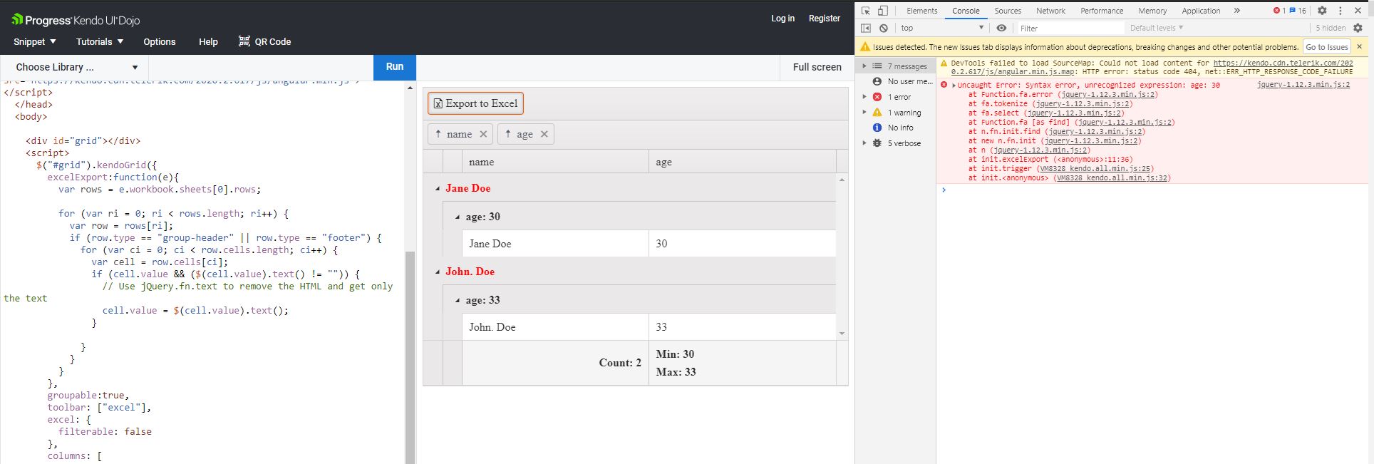That code work good for level one groupings, but if you want grouping by two fields, the code of exportExcell fails for level two groupings.
