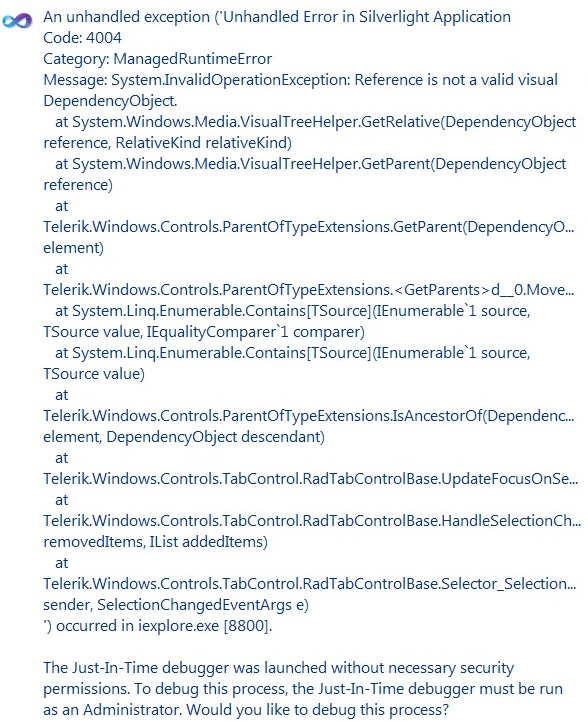 I have a TabControl with an ItemTemplate and the tabs content is defined in a ContentTemplate. Basically each tab contains a couple of RichTextBoxes (standard MS). See screenshot #1. This works fine; I can databind an arbitrary number of tabs and switch between them. But when there is a hyperlink/URL in the XAML of the RichTextBox the application throws an exception when I switch to or from this tab (never on first load). From attached screenshot #2 it seems that the TabControl is at fault, but I'm not sure. I'm unable to provoke this behaviour if there is no hyperlink in the XAML.