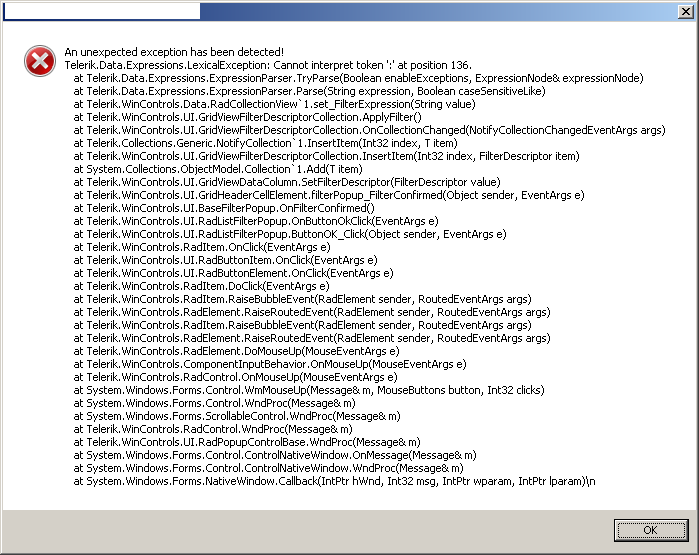 I get this exception trying to filter a column on a radgridview setup as "Excel-like" mode.