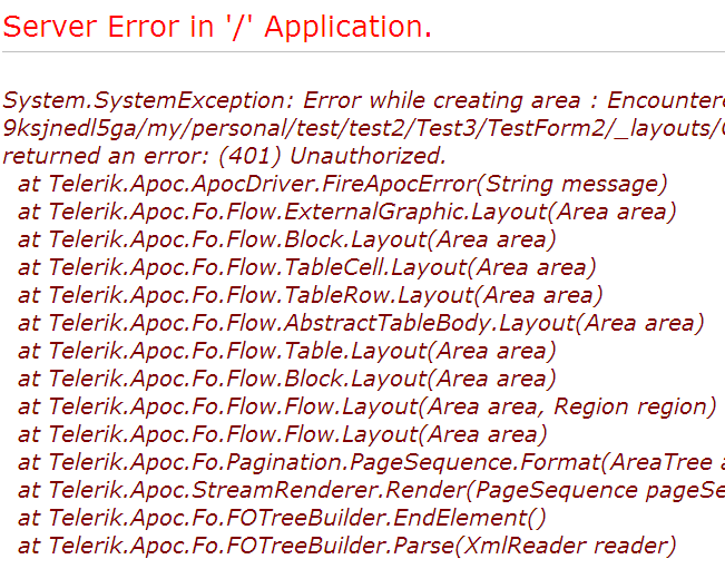 I am using RadGrid in my webpart in SP2010. When i want to export data to PDF, it throw exception "Error while creating area : Encountered web exception while fetching image from http://win9ksjnedl5ga/my/personal/test/test2/Test3/TestForm2/_layouts/MyProduct/WAResources/Invariant/Images/DownArrowButton.gif: The remote server returned an error: (401) Unauthorized."