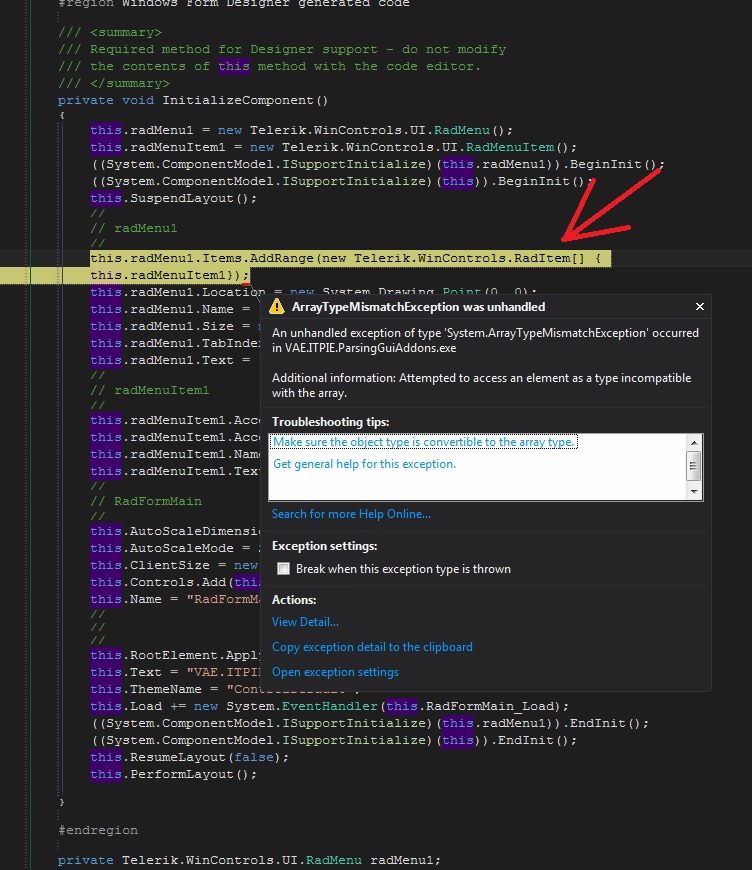 Could you send me a sample project or video which demonstrates the exception on your side? It would be helpful to give me information which version of Telerik UI for Winforms, Operating System and Visual Studio you use. Thank you in advance.