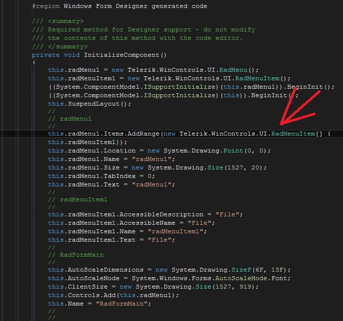 this.radMenu1.Items.AddRange(new Telerik.WinControls.RadItem[] { this.radMenuItem1});The process we use is to create a new Windows Forms app, add RadMenu to it and add items either via the design time surface, or via the Items collection. Which approach are you using? (attached you can find my test app).