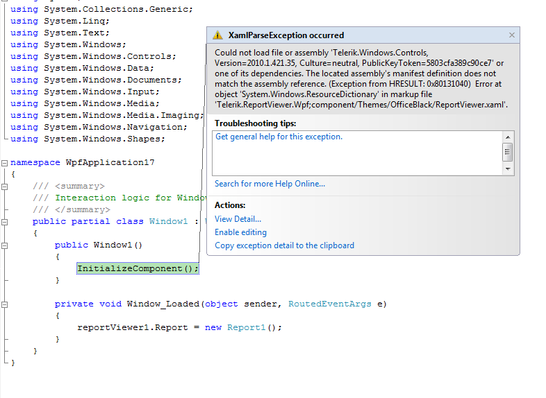 Could not load file or assembly 'Telerik.Windows.Controls, Version=2010.1.421.35, Culture=neutral, PublicKeyToken=5803cfa389c90ce7' or one of its dependencies. The located assembly's manifest definition does not match the assembly reference. (Exception from HRESULT: 0x80131040) Error at object 'System.Windows.ResourceDictionary' in markup file 'Telerik.ReportViewer.Wpf;component/Themes/OfficeBlack/ReportViewer.xaml'.The problem occurs when I run the WPF Application which has the Report viewer