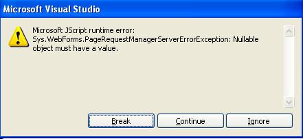 I am working on several pages that have Rad controls. When I run these pages in the Visual Studio debugger and my server-side code throws an exception, it always shows up as if it is a Javascript exception. (See the attached screenshot). I believe this happens whenever I have a RadAjaxPanel on the page.