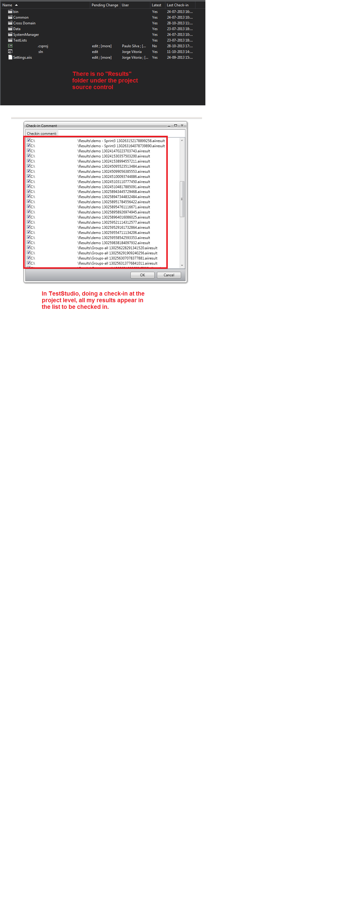 What I would like to know is if there is a way from me to exclude the Results folder from appearing on the items list to be check-in, because every time I want to do a global check-in (project level) I must uncheck all the result file that I have for every TestList that I've ran.