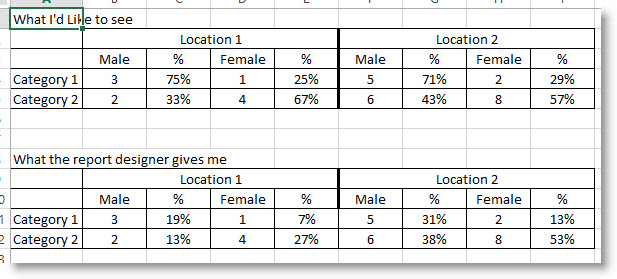 We are working on a crosstab report where there is a row group (Category) and two column groups (Location and Gender), and we are showing total hours as the value. What we'd like to do is to show the hours as a percentage of the total for that Category and Location. The attached screenshot shows what we want, and also what the report designer gives us.