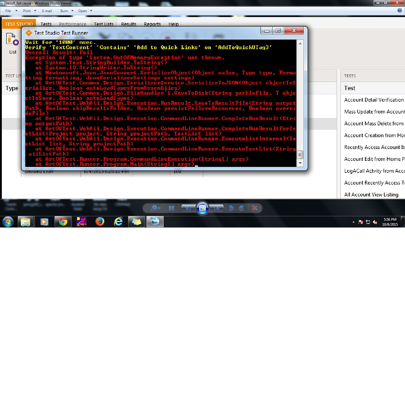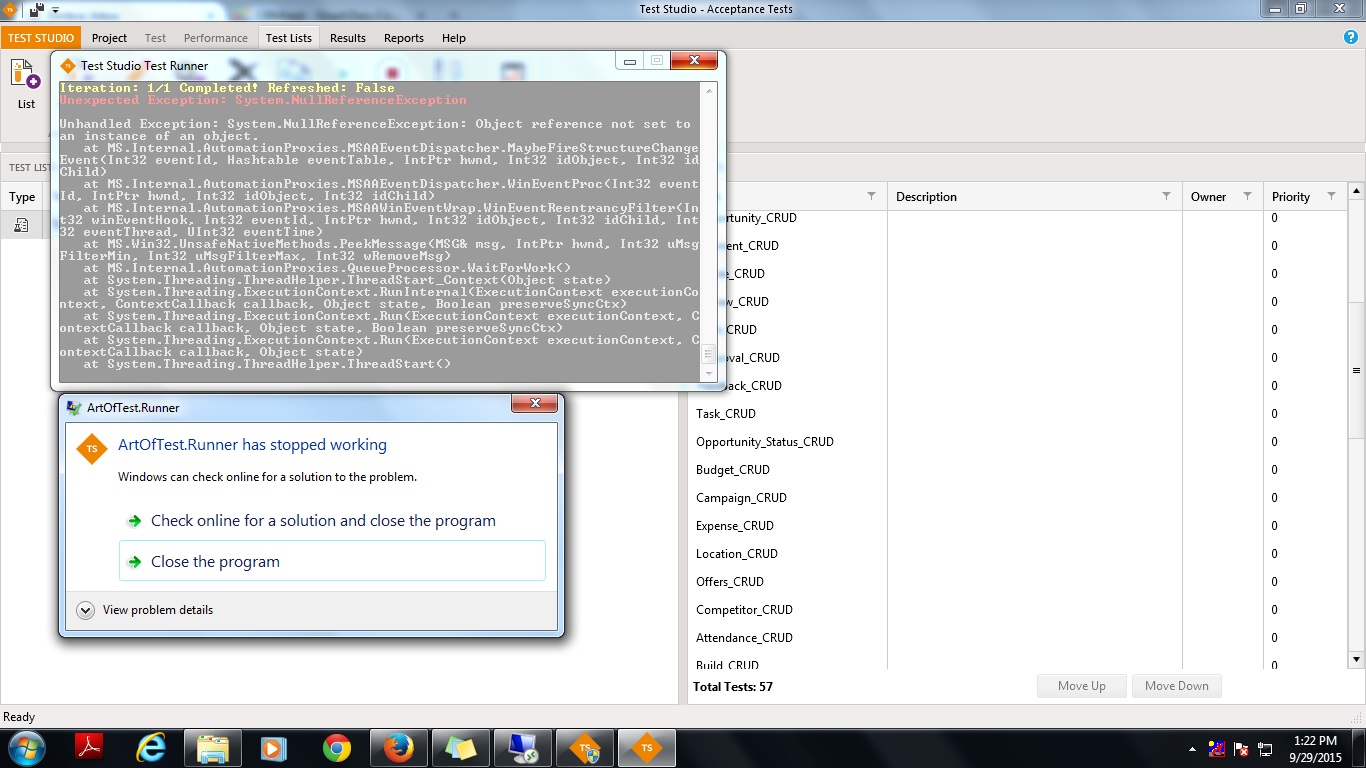 I have faced some execution problem from quite a sometime. While executing the suite, ArtOfTest.Runner.exe has been stopped and subsequently execution of the suite has been stopped. Previously this error occurs when our test suite contains around 250 test scripts, so to solve the problem we partitioned it into 2 different suites, Each contains around 100 scripts. But the same problem still persist for 100 scripts as well. Please provide me the appropriate solution for the above problem ASAP.