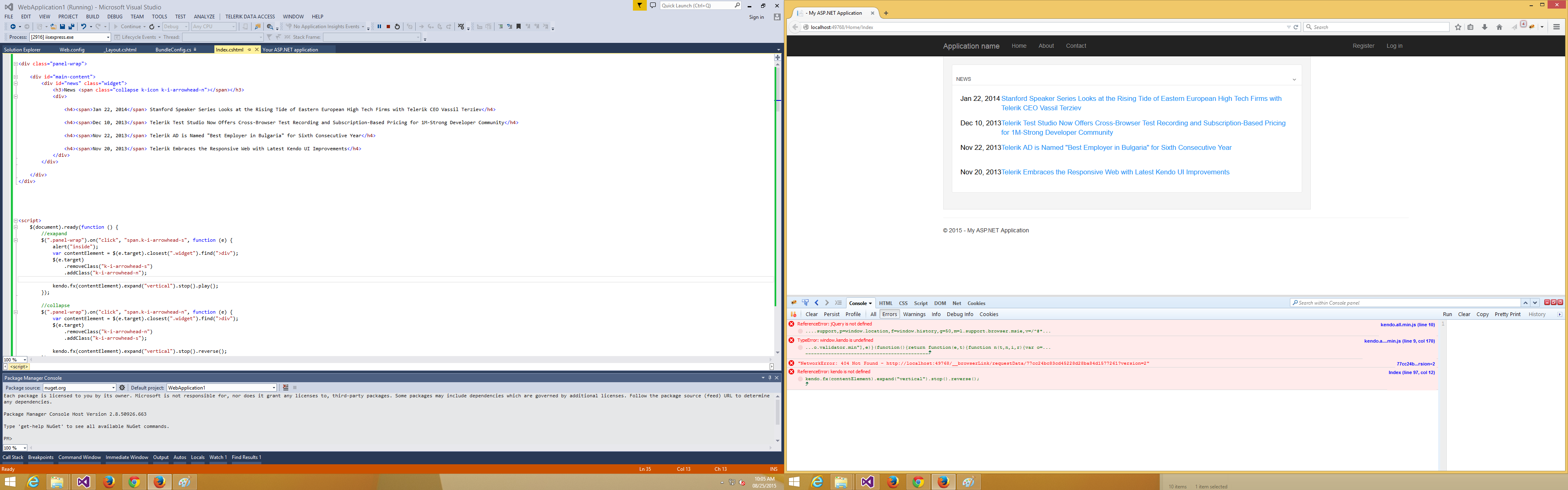 <div class="panel-wrap"> <div id="main-content"> <div id="news" class="widget"> <h3>News <span class="collapse k-icon k-i-arrowhead-n"></span></h3> <div> <h4><span>Jan 22, 2014</span> Stanford Speaker Series Looks at the Rising Tide of Eastern European High Tech Firms with Telerik CEO Vassil Terziev</h4> <h4><span>Dec 10, 2013</span> Telerik Test Studio Now Offers Cross-Browser Test Recording and Subscription-Based Pricing for 1M-Strong Developer Community</h4> <h4><span>Nov 22, 2013</span> Telerik AD is Named "Best Employer in Bulgaria" for Sixth Consecutive Year</h4> <h4><span>Nov 20, 2013</span> Telerik Embraces the Responsive Web with Latest Kendo UI Improvements</h4> </div> </div> </div></div><script> $(document).ready(function () { //exapand $(".panel-wrap").on("click", "span.k-i-arrowhead-s", function (e) { var contentElement = $(e.target).closest(".widget").find(">div"); $(e.target) .removeClass("k-i-arrowhead-s") .addClass("k-i-arrowhead-n"); kendo.fx(contentElement).expand("vertical").stop().play(); }); //collapse $(".panel-wrap").on("click", "span.k-i-arrowhead-n", function (e) { var contentElement = $(e.target).closest(".widget").find(">div"); $(e.target) .removeClass("k-i-arrowhead-n") .addClass("k-i-arrowhead-s"); kendo.fx(contentElement).expand("vertical").stop().reverse(); }); });</script>