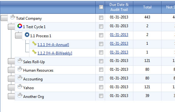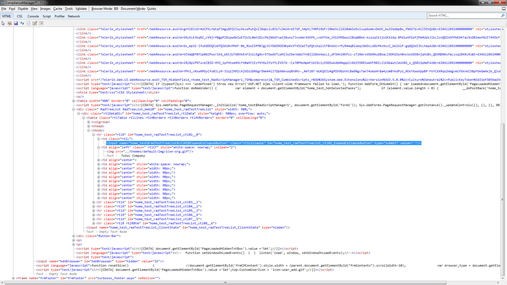 <telerik:RadTreeList Width="98%" ID="radTestTreeList" runat="server" AutoGenerateColumns="False" DataKeyNames="TASK_ID" ParentDataKeyNames="PARENT_TASK_ID" OnNeedDataSource="radTestTreeList_NeedDataSource" Skin="Web20" AllowMultiItemSelection="True" AllowRecursiveSelection="True" PageSize="15" > <ExportSettings ExportMode="RemoveControls"><Pdf PageWidth="8.5in" PageHeight="11in"></Pdf></ExportSettings> <PagerStyle AlwaysVisible="True" Mode="NextPrevNumericAndAdvanced" Position="TopAndBottom" /> <ClientSettings> <Selecting AllowItemSelection="True" UseSelectColumnOnly="True" /> <Scrolling ScrollHeight="500px" AllowScroll="True" /> </ClientSettings> <Columns> <telerik:TreeListTemplateColumn ReadOnly="True"> <ItemTemplate> <%# getIcon( Container.DataItem ) %> <%# getTestLabel( Container.DataItem ) %> </ItemTemplate> <ItemStyle Wrap="False" HorizontalAlign="Left" /> </telerik:TreeListTemplateColumn> <telerik:TreeListTemplateColumn readonly="true"> <HeaderStyle Width="80" HorizontalAlign="Center" /> <ItemTemplate> <%# getMarkers( Container.DataItem ) %> <%# getAnchor( Container.DataItem ) %> </ItemTemplate> <ItemStyle HorizontalAlign="Center" /> </telerik:TreeListTemplateColumn> <telerik:TreeListSelectColumn> <HeaderStyle Width="30" HorizontalAlign="Center" /> <Itemstyle HorizontalAlign="Center" Wrap="false" /> </telerik:TreeListSelectColumn> <telerik:TreeListTemplateColumn HeaderText="Due Date &<BR>Audit Trail"> <ItemTemplate> <span id="spDueDate" runat="server"><%# getDueDate( Container.DataItem ) %></span> <telerik:RadToolTip ID="RadToolTip1" runat="server" TargetControlID="spDueDate" RelativeTo="Element" Position="BottomCenter" Animation="Slide" RenderInPageRoot="true" EnableShadow="true"> <br /> This is the Due Date for a control or a rollup of the earliest due date. <br /> If at the control level click on the link to view the Audit Popup. <br /> <br /> </telerik:RadToolTip> </ItemTemplate> <HeaderStyle HorizontalAlign="Center" Width="90px" /><ItemStyle HorizontalAlign="Center" Width="90px"></ItemStyle> </telerik:TreeListTemplateColumn> <telerik:TreeListBoundColumn DataField="CA_TOTAL" HeaderText="Total" > <ItemStyle HorizontalAlign="Center" Width="90px" /> <HeaderStyle HorizontalAlign="Center" Width="90px" /> </telerik:TreeListBoundColumn> <telerik:TreeListBoundColumn DataField="CA_NOT_STARTED" HeaderText="Not Started" > <HeaderStyle HorizontalAlign="Center" Width="90px" /> <ItemStyle HorizontalAlign="Center" Width="90px" /> </telerik:TreeListBoundColumn> <telerik:TreeListBoundColumn DataField="CA_IN_PROGRESS" HeaderText="In Progress" > <HeaderStyle HorizontalAlign="Center" Width="90px" /> <ItemStyle HorizontalAlign="Center" Width="90px" /> </telerik:TreeListBoundColumn> <telerik:TreeListBoundColumn DataField="CA_APPROVED" HeaderText="Complete" > <ItemStyle HorizontalAlign="Center" Width="90px" /> <HeaderStyle HorizontalAlign="Center" Width="90px" /> </telerik:TreeListBoundColumn> <telerik:TreeListBoundColumn DataField="CA_PAST_CNT" HeaderText="Past Due" > <ItemStyle HorizontalAlign="Center" Width="90px" /> <HeaderStyle HorizontalAlign="Center" Width="90px" /> </telerik:TreeListBoundColumn> <telerik:TreeListBoundColumn DataField="CA_CONTROLS_NOT_SELECTED_FOR_TESTING" HeaderText="Controls<br>Not Tested" > <HeaderStyle HorizontalAlign="Center" Width="90px" /> <ItemStyle HorizontalAlign="Center" Width="90px" /> </telerik:TreeListBoundColumn> <telerik:TreeListBoundColumn DataField="CA_CONTROLS_REJECTED_IN_TESTING" HeaderText="Ineffective<br>Controls" > <HeaderStyle HorizontalAlign="Center" Width="90px" /> <ItemStyle HorizontalAlign="Center" Width="90px" /> </telerik:TreeListBoundColumn> <telerik:TreeListBoundColumn DataField="TASK_ID" Visible="false" UniqueName="TASK_ID" > </telerik:TreeListBoundColumn> </Columns><EditFormSettings EditFormType="AutoGenerated"></EditFormSettings></telerik:RadTreeList>0