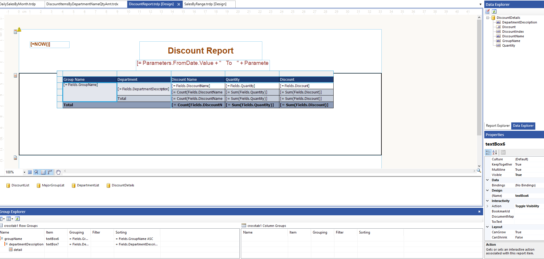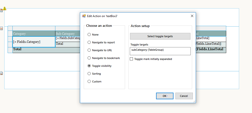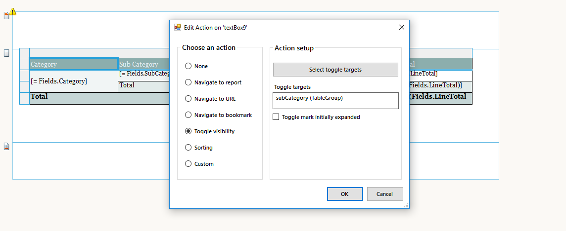 In simple words, currently both the textboxes ("Group Name" header & [=Fields.GroupName] have the same target for the toggle action which is departmentDescription (TableGroup) but the header expands the departments for all groups whereas the other expands the departments for just for that group. All ok except the toggle button sign. Hope I make sense.