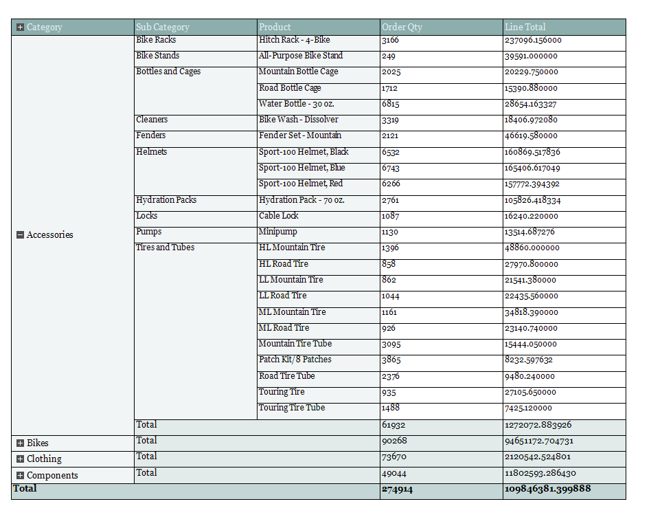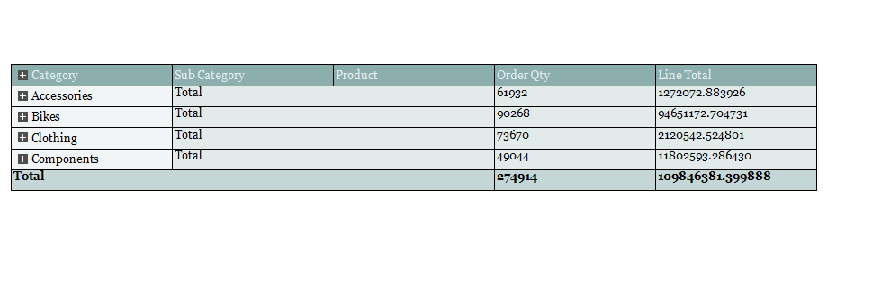 As you can see in Collapsed.png , the toggle button on the Category header and the toggle buttons on the individual category names (Accessories/Bikes/Clothing/Components) are all in collapsed mode initially. When I click on the toggle button next to a category name, say Accessories, the sub categories for that category alone are expanded (AccesoriesExpanded.png).