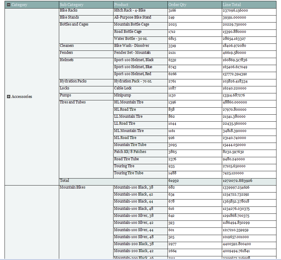 ORDER BY Category, SubCategory, Product