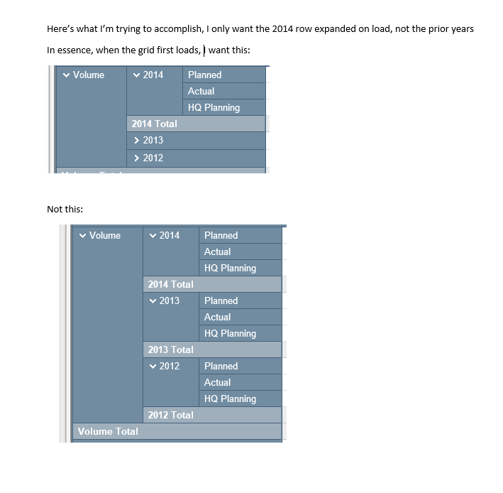 I have a Pivot grid with three row groups broken down by Category (1st level), Year (2nd), and Description (3rd). I have three years (2014,2013,2012) for the Year row groups which is on the second level, but I only want to expand 2014 programmatically on the initial load, and keep 2013 and 2012 collapsed. I looked at the reference commonly sited here but I only see how that works for the first level groupings, not the second level groupings.
