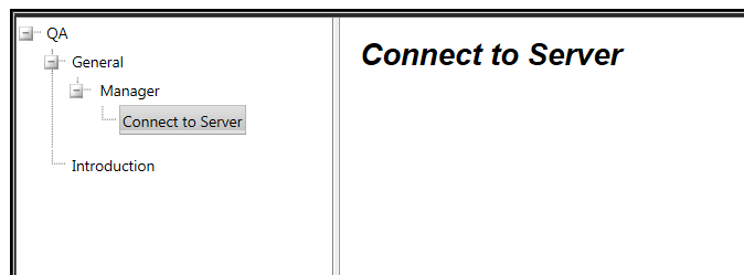 <telerik:RadSplitter ID="RadSplitter1" runat="server" Width="100%" Height="700px"> <telerik:RadPane ID="LeftPane" runat="server" Width="250px" Scrolling="Both"> <asp:Panel ID="QAGuidePanel" runat="server" Width="100%" HorizontalAlign="Left"> <asp:SqlDataSource ID="QAGuideSqlDataSource" runat="server" ConnectionString="<%$ ConnectionStrings:GuidesConnectionString %>" SelectCommand="SELECT [SerID], ('~/QA/Pages/' + [Path] + '.aspx') as FullPath, [ParentID], [Title] FROM [QAGuide]"></asp:SqlDataSource> <telerik:RadTreeView ID="QAGuideRadTreeView" runat="server" DataSourceID="QAGuideSqlDataSource" DataNavigateUrlField="FullPath" DataFieldParentID="ParentID" DataFieldID="SerID" DataTextField="Title" > <DataBindings> <telerik:RadTreeNodeBinding Depth="0" Expanded="true" /> </DataBindings> </telerik:RadTreeView> </asp:Panel> </telerik:RadPane> <telerik:RadSplitBar ID="Radsplitbar1" runat="server"></telerik:RadSplitBar> <telerik:RadPane ID="MiddlePane1" runat="server" Scrolling="None"> <telerik:RadSplitter ID="Radsplitter2" runat="server" Orientation="Horizontal" VisibleDuringInit="false"> <telerik:RadPane ID="Radpane2" runat="server"> <div style="padding: 5px"> <asp:ContentPlaceHolder id="ContentPlaceHolder1" runat="server"> </asp:ContentPlaceHolder> <asp:Panel ID="ContentPanel" style="margin:10px;" HorizontalAlign="Left" runat="server"> <asp:Label ID="SerIDLabel" Visible="false" runat="server" ></asp:Label> <asp:SqlDataSource ID="ContentSqlDataSource" runat="server" ConnectionString="<%$ ConnectionStrings:GuidesConnectionString %>" SelectCommand="SELECT * FROM [QAGuide] WHERE ([SerID] = @SerID)"> <SelectParameters> <asp:ControlParameter ControlID="SerIDLabel" Name="SerID" PropertyName="Text" Type="Int64" /> </SelectParameters> </asp:SqlDataSource> <asp:FormView ID="ContentFormView" runat="server" Visible="true" Width="100%" DataKeyNames="SerID" DataSourceID="ContentSqlDataSource"> <ItemTemplate> <asp:Label ID="TitleLabel" SkinID="HeaderText" runat="server" Text='<%# Eval("Title") %>' /> <br /><br /> <asp:Label ID="TextCnsrtLabel" runat="server" Text='<%# Eval("Cntnt") %>' ></asp:Label> </ItemTemplate> </asp:FormView> </asp:Panel> </div> </telerik:RadPane> </telerik:RadSplitter> </telerik:RadPane> </telerik:RadSplitter>2) How can I hide the root node (In this case the QA node)?