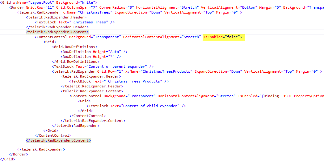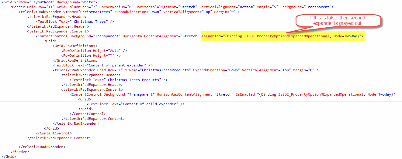 <!--Christmas Trees Option M --> <Border Grid.Row="11" Grid.ColumnSpan="7" CornerRadius="0" HorizontalAlignment="Stretch" VerticalAlignment="Bottom" Margin="5" Background="Transparent"> <telerik:RadExpander x:Name="ChristmasTrees" ExpandDirection="Down" VerticalAlignment="Top" Margin="0" > <telerik:RadExpander.Header> <TextBlock Text=" Christmas Trees" /> </telerik:RadExpander.Header> <telerik:RadExpander.Content> <ContentControl Background="Transparent" HorizontalContentAlignment="Stretch" IsEnabled="{Binding IsSDI_PropertyOptionMExpandedOperational, Mode=TwoWay}"> <Grid> <Grid.ColumnDefinitions> <ColumnDefinition Width="Auto"/> <ColumnDefinition Width="Auto"/> <ColumnDefinition Width="Auto"/> <ColumnDefinition Width="Auto"/> </Grid.ColumnDefinitions> <Grid.RowDefinitions> <RowDefinition/> <RowDefinition/> <RowDefinition/> <RowDefinition/> <RowDefinition/> <RowDefinition/> <RowDefinition/> <RowDefinition/> <RowDefinition/> <RowDefinition/> <RowDefinition/> <RowDefinition/> </Grid.RowDefinitions> <TextBlock Grid.Row="0" Grid.Column="0" Text="Are the annual gross receipts for the flower, greenhouse, nursery, Christmas Tree" VerticalAlignment="Center" Margin="5" /> <TextBlock Grid.Row="1" Grid.Column="0" Text=" business incidental to the annual gross receipts for the farming operation? " VerticalAlignment="Center" Margin="5" /> <StackPanel Grid.Row="1" Grid.Column="1" Orientation="Horizontal" Margin="0"> <RadioButton GroupName="AnnualGrossReceiptsIncidentalFlower" Content="Yes" IsChecked="{Binding FlowerGreenhouseNurseryChristmasTree.AnnualGrossReceiptsIncidental, Mode=TwoWay}" Margin="5" /> <RadioButton GroupName="AnnualGrossReceiptsIncidentalFlower" Content="No" IsChecked="{Binding FlowerGreenhouseNurseryChristmasTree.AnnualGrossReceiptsIncidental, Mode=TwoWay, Converter={StaticResource BoolInverseConverter}}" Margin="5" /> </StackPanel> <TextBlock Grid.Row="2" Grid.Column="0" Text="What type of plants or produce are being grown and/or sold? " VerticalAlignment="Center" Margin="5" /> <StackPanel Grid.Row="2" Grid.Column="1" Orientation="Horizontal" Margin="0"> <CheckBox Name="Flowers3" Content="Flowers" IsChecked="{Binding FlowerGreenhouseNurseryChristmasTree.HasFlowers, Mode=TwoWay}" Margin="5" /> <CheckBox Name="Fruit3" Content="Fruits" IsChecked="{Binding FlowerGreenhouseNurseryChristmasTree.HasFruit, Mode=TwoWay}" Margin="5" /> <CheckBox Name ="Vegetables3" Content="Vegetables" IsChecked="{Binding FlowerGreenhouseNurseryChristmasTree.HasVegetables, Mode=TwoWay}" Margin="5" /> </StackPanel> <StackPanel Grid.Row="3" Grid.Column="1" Orientation="Horizontal" Margin="0"> <CheckBox Name ="Shrubs3" Content="Shrubs" IsChecked="{Binding FlowerGreenhouseNurseryChristmasTree.HasShrubs, Mode=TwoWay}" Margin="5" /> <CheckBox Name="Trees3" Content="Trees" IsChecked="{Binding FlowerGreenhouseNurseryChristmasTree.HasTrees, Mode=TwoWay}" Margin="5" /> <CheckBox Name="Other3" Content="Other Plants" IsChecked="{Binding FlowerGreenhouseNurseryChristmasTree.HasOther, Mode=TwoWay}" Margin="5" /> </StackPanel> <TextBlock Grid.Row="4" Grid.Column="0" Text="What are the annual gross receipts sold on premises? " VerticalAlignment="Center" Margin="5"/> <telerikInput:RadMaskedCurrencyInput Grid.Row="4" Grid.Column="1" Value="{Binding FlowerGreenhouseNurseryChristmasTree.AnnualGrossReceiptsOnPremises, Mode=TwoWay, Converter={StaticResource StringToDecimalConverter}}" Mask="#9.2" Margin="5" Width="100" HorizontalContentAlignment="Left" EmptyContent="0" SelectionOnFocus="SelectAll" TextMode="PlainText"/> <TextBlock Grid.Row="5" Grid.Column="0" Text="What are the annual gross receipts sold off premises? " VerticalAlignment="Center" Margin="5"/> <telerikInput:RadMaskedCurrencyInput Grid.Row="5" Grid.Column="1" Value="{Binding FlowerGreenhouseNurseryChristmasTree.AnnualGrossReceiptsOffPremises, Mode=TwoWay, Converter={StaticResource StringToDecimalConverter}}" Mask="#9.2" Margin="5" Width="100" HorizontalContentAlignment="Left" EmptyContent="0" SelectionOnFocus="SelectAll" TextMode="PlainText"/> <TextBlock Grid.Row="6" Grid.Column="0" Text="Is there any processing of products? " VerticalAlignment="Center" Margin="5" /> <StackPanel Grid.Row="6" Grid.Column="1" Orientation="Horizontal" Margin="0"> <RadioButton GroupName="ProductProcessing" Content="Yes" IsChecked="{Binding FlowerGreenhouseNurseryChristmasTree.ProductProcessing, Mode=TwoWay}" Margin="5" /> <RadioButton GroupName="ProductProcessing" Content="No" IsChecked="{Binding FlowerGreenhouseNurseryChristmasTree.ProductProcessing, Mode=TwoWay, Converter={StaticResource BoolInverseConverter}}" Margin="5" /> </StackPanel> <TextBlock Grid.Row="7" Grid.Column="0" Text="Is there a retail store on the premises? " VerticalAlignment="Center" Margin="5" /> <StackPanel Grid.Row="7" Grid.Column="1" Orientation="Horizontal" Margin="0"> <RadioButton GroupName="RetailStoreOnPremises" Content="Yes" IsChecked="{Binding FlowerGreenhouseNurseryChristmasTree.RetailStoreOnPremises, Mode=TwoWay}" Margin="5" /> <RadioButton GroupName="RetailStoreOnPremises" Content="No" IsChecked="{Binding FlowerGreenhouseNurseryChristmasTree.RetailStoreOnPremises, Mode=TwoWay, Converter={StaticResource BoolInverseConverter}}" Margin="5" /> </StackPanel> <TextBlock Grid.Row="8" Grid.Column="0" Text="Remarks about the business:" VerticalAlignment="Center" Margin="5"/> <TextBox Grid.Row="8" Grid.Column="1" Grid.ColumnSpan="3" Text="{Binding FlowerGreenhouseNurseryChristmasTree.BusinessRemarks, Mode=TwoWay}" Margin="5" Height="25" Width="600" MaxLength="550" HorizontalAlignment="Left"/> </Grid> </ContentControl> </telerik:RadExpander.Content> <telerik:RadExpander x:Name="ChristmasTreesProducts" ExpandDirection="Down" VerticalAlignment="Top" Margin="0" > <telerik:RadExpander.Header> <TextBlock Text=" Christmas Trees Products" /> </telerik:RadExpander.Header> <telerik:RadExpander.Content> <ContentControl Background="Transparent" HorizontalContentAlignment="Stretch" IsEnabled="{Binding IsSDI_PropertyOptionMEx