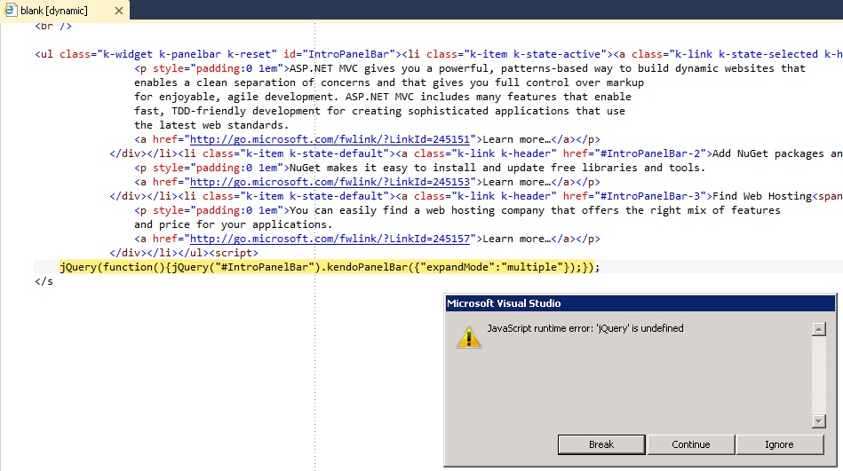 I am using VS2010 (client's choice, not mine), but aside from that it's the sample website built from the 'Telerik C# MVC Web Application' template (right out of the box).