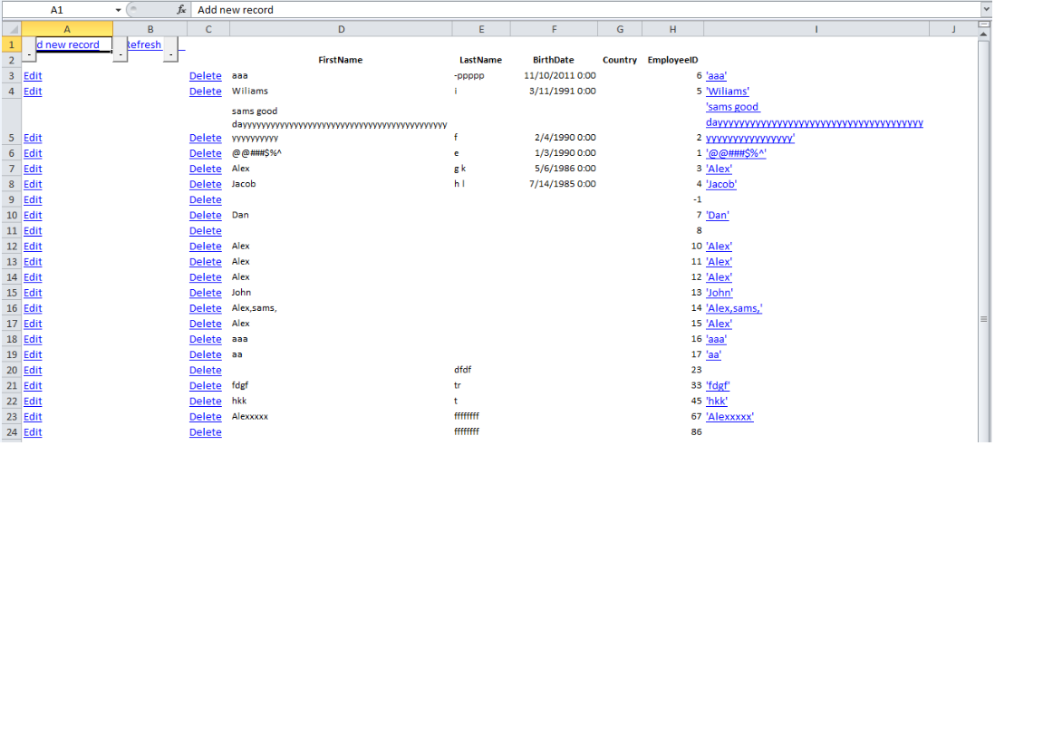 <telerik:RadGrid ID="grid1" runat="server" CellSpacing="0" DataSourceID="SqlDataSource1" AllowPaging="true" OnItemCreated="grid1_ItemCreated" OnExcelExportCellFormatting="grid1_ExcelExportCellFormatting"> <ExportSettings IgnorePaging="true" OpenInNewWindow="true"> </ExportSettings> <MasterTableView AutoGenerateColumns="False" CommandItemDisplay="Top" DataKeyNames="EmployeeID"> <CommandItemSettings ShowExportToPdfButton="true" /> <Columns> .... ... ... <telerik:GridHyperLinkColumn DataTextFormatString="Search Google for '{0}'" DataNavigateUrlFields="FirstName" UniqueName="FirstName" DataNavigateUrlFormatString="http://www.google.com/search?hl=en&q={0} btnG=Google+Search" DataTextField="FirstName"> </telerik:GridHyperLinkColumn> </Columns> </MasterTableView></telerik:RadGrid>Thanks,