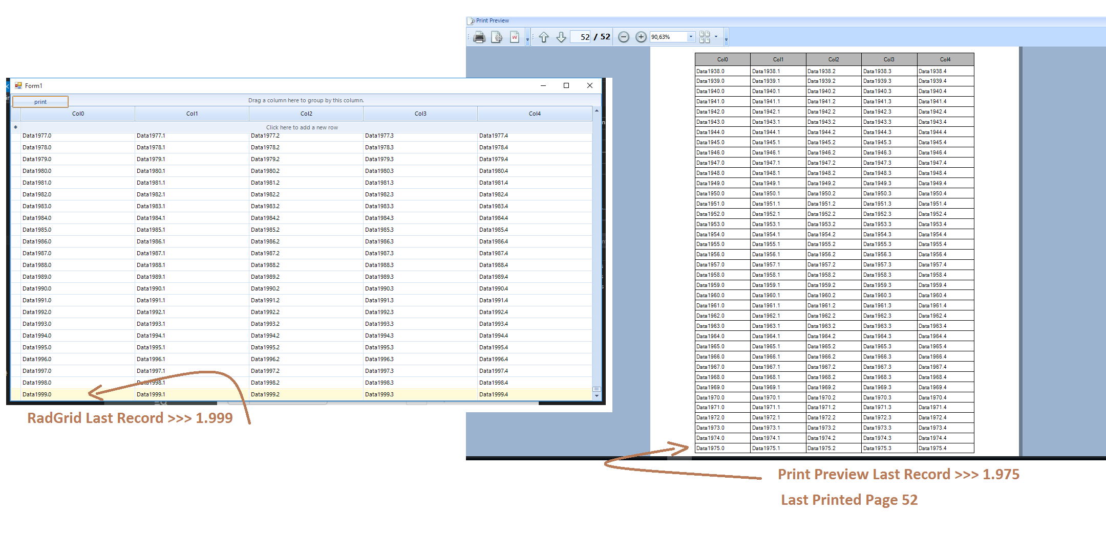 I used RadPrindPreview for RadPrintDocument associated to a RadGridView to export data,
