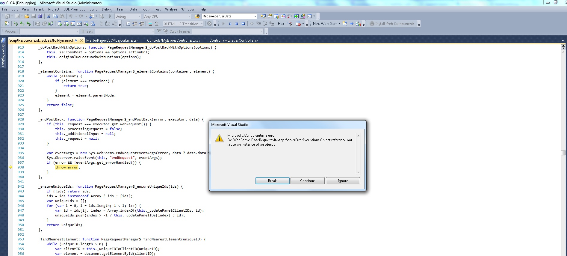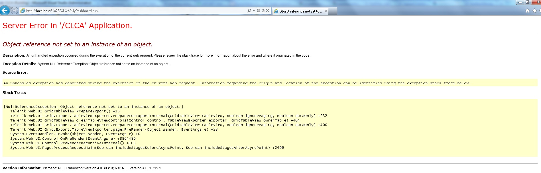 - After registering RadAjaxManager event in MyIssueControl to execute function OnRequestStart which will disable Ajax for exporting functionality (as it required for export explain in help documents) its now throwing new error (Error.jpg)