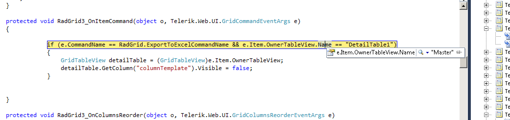 if (e.CommandName == RadGrid.ExportToExcelCommandName || e.CommandName == RadGrid.ExportToPdfCommandName || e.CommandName == RadGrid.ExportToCsvCommandName || e.CommandName == RadGrid.ExportToWordCommandName) { RadGrid1.MasterTableView.DetailTables[0].Columns.FindByUniqueName("columnBound").Display = true; RadGrid1.MasterTableView.DetailTables[0].Columns.FindByUniqueName("columnTemplate").Visible = false; RadGrid1.MasterTableView.DetailTables[0].Columns.FindByUniqueName("columnTemplate").Display = false;}Can you please help?