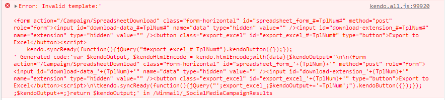 I have a grid that contains a child detail spreadsheet. I am trying to duplicate some code I used from another Kendo Spreadsheet, but each spreadsheet and Export button needs to have a unique id. In the form I am using to export the Excel for the spreadsheet, I am using a Kendo Button to allow addition of the unique id (TplNum) from the parent grid. For some reason, the template is not valid when I add the Kendo Button. Any ideas?