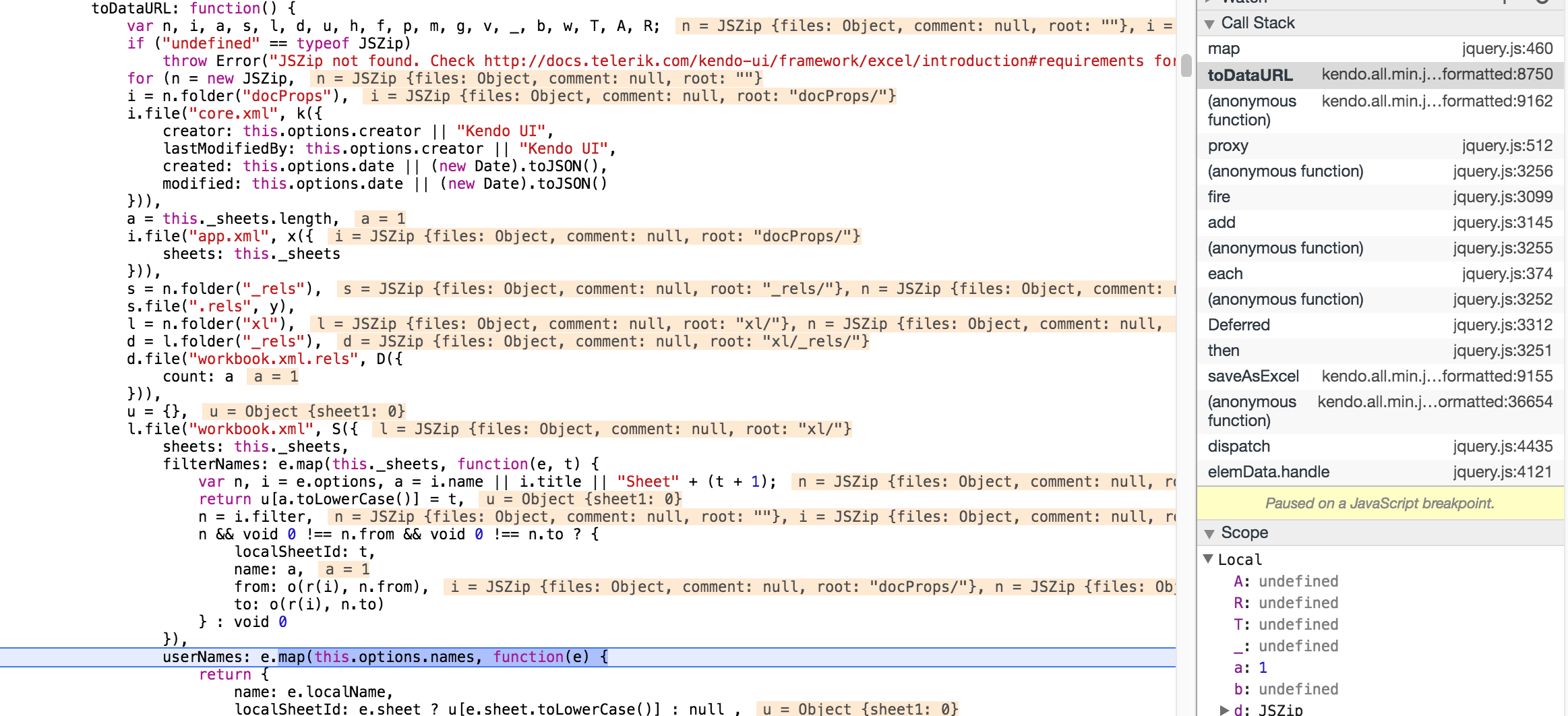 I am trying to figure out why exporting to excel does not work for me. After some digging into kendo's src code, this is the result of "this.options.name" is undefined - where 'this' is a WorkBook Object. This error is in the public "toDataUrl" function. Attached is the line in which it errors out - and below is the options I have for the grid.