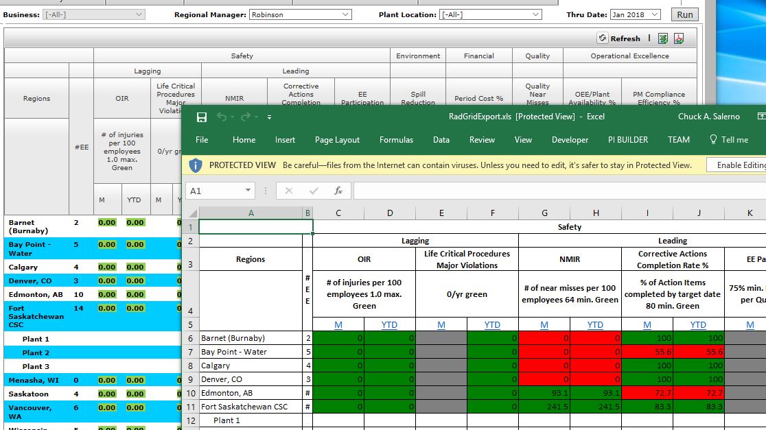 Case RadGrid.ExportToPdfCommandName IsPDFExporting = True grdScoreCardDashboard.ExportSettings.Pdf.BorderType = GridPdfSettings.GridPdfBorderType.AllBorders grdScoreCardDashboard.ExportSettings.OpenInNewWindow = True grdScoreCardDashboard.ExportSettings.IgnorePaging = False grdScoreCardDashboard.ExportSettings.Pdf.PageHeight = Unit.Parse("162mm") grdScoreCardDashboard.ExportSettings.Pdf.PageWidth = Unit.Parse("600mm") grdScoreCardDashboard.ExportSettings.Pdf.PageRightMargin = Unit.Parse("10mm") grdScoreCardDashboard.ExportSettings.Pdf.PageLeftMargin = Unit.Parse("10mm") grdScoreCardDashboard.ExportSettings.Pdf.Title = "Score Card" grdScoreCardDashboard.ExportSettings.Pdf.PaperSize = GridPaperSize.Letter grdScoreCardDashboard.ExportSettings.FileName = String.Format("ScoreCardOutput-{0}", DateTime.Now.ToString("yyyyMMddhhmmss")) grdScoreCardDashboard.ExportSettings.Pdf.AllowPrinting = True grdScoreCardDashboard.ExportSettings.Pdf.AllowModify = True grdScoreCardDashboard.ExportSettings.Pdf.AllowCopy = True grdScoreCardDashboard.ExportSettings.ExportOnlyData = False grdScoreCardDashboard.ExportSettings.Pdf.FontType = Telerik.Web.Apoc.Render.Pdf.FontType.Embed For Each item As GridDataItem In grdScoreCardDashboard.Items Dim cellDisplay As Label = item.FindControl("lblRegion") If Not IsNothing(cellDisplay) Then If cellDisplay.Text.StartsWith("Plant") Then cellDisplay.Style.Add("padding-left", "20px") LoadAttributes(item.FindControl("lbCol9M"), 10, cellDisplay.Text) Else item.Cells(item.ItemIndex).Style("background-color") = LoadAttributes(item.FindControl("lbCol1M"), 1, cellDisplay.Text) LoadAttributes(item.FindControl("lbCol1YTD"), 14, cellDisplay.Text) item.PrepareItemStyle() item.PrepareItemVisibility() End If End If Next 'If column.UniqueName.Equals("lbCol2M") And Not DirectCast(sender, Telerik.Web.UI.RadGrid).Items(intRowIdx).KeyValues.Contains("Plant ") Then ' e.Cell.Style("background-color") = LoadAttributesGray(e.Cell.Parent.FindControl("lbCol2M"), 17) 'End If 'If column.UniqueName.Equals("lbCol2YTD") Then ' e.Cell.Style("background-color") = LoadAttributes(e.Cell.Parent.FindControl("lbCol2YTD"), 18, strLocation) 'End If 'If column.UniqueName.Equals("lbCol3M") Then ' e.Cell.Style("background-color") = LoadAttributes(e.Cell.Parent.FindControl("lbCol3M"), 4, strLocation) 'End If 'If column.UniqueName.Equals("lbCol3YTD") Then ' e.Cell.Style("background-color") = LoadAttributes(e.Cell.Parent.FindControl("lbCol3YTD"), 5, strLocation) 'End If 'If column.UniqueName.Equals("lbCol4M") Then ' e.Cell.Style("background-color") = LoadAttributes(e.Cell.Parent.FindControl("lbCol4M"), 8, strLocation) 'End If 'If column.UniqueName.Equals("lbCol4YTD") Then ' e.Cell.Style("background-color") = LoadAttributes(e.Cell.Parent.FindControl("lbCol4YTD"), 9, strLocation) 'End If 'If column.UniqueName.Equals("lbCol5M") And Not DirectCast(sender, Telerik.Web.UI.RadGrid).Items(intRowIdx).KeyValues.Contains("Plant ") Then ' e.Cell.Style("background-color") = LoadAttributesGray(e.Cell.Parent.FindControl("lbCol5M"), 19) 'End If 'If column.UniqueName.Equals("lbCol5YTD") Then ' e.Cell.Style("background-color") = LoadAttributes(e.Cell.Parent.FindControl("lbCol5YTD"), 20, strLocation) 'End If 'If column.UniqueName.Equals("lbCol6M") Then ' ' e.Cell.Style("background-color") = LoadAttributes(e.Cell.Parent.FindControl("lbCol6M"), 21, strLocation) 'End If 'If column.UniqueName.Equals("lbCol6YTD") Then ' e.Cell.Style("background-color") = LoadAttributes(e.Cell.Parent.FindControl("lbCol6YTD"), 22, strLocation) 'End If ''Period Cost 'If column.UniqueName.Equals("lbCol7M") Then ' e.Cell.Style("background-color") = LoadAttributes(e.Cell.Parent.FindControl("lbCol7M"), 23, strLocation) 'End If 'If column.UniqueName.Equals("lbCol7YTD") Then ' e.Cell.Style("background-color") = LoadAttributes(e.Cell.Parent.FindControl("lbCol7YTD"), 24, strLocation) 'End If 'If column.UniqueName.Equals("lbCol8M") Then ' e.Cell.Style("background-color") = LoadAttributes(e.Cell.Parent.FindControl("lbCol8M"), 27, strLocation) 'End If 'If column.UniqueName.Equals("lbCol8YTD") Then ' e.Cell.Style("background-color") = LoadAttributes(e.Cell.Parent.FindControl("lbCol8YTD"), 28, strLocation) 'End If 'If column.UniqueName.Equals("lbCol9M") Then ' e.Cell.Style("background-color") = LoadAttributes(e.Cell.Parent.FindControl("lbCol9M"), 10, strLocation) 'End If 'If column.UniqueName.Equals("lbCol9YTD") Then ' e.Cell.Style("background-color") = LoadAttributes(e.Cell.Parent.FindControl("lbCol9YTD"), 11, strLocation) 'End If 'If column.UniqueName.Equals("lbCol10M") Then ' e.Cell.Style("background-color") = LoadAttributes(e.Cell.Parent.FindControl("lbCol10M"), 12, strLocation) 'End If 'If column.UniqueName.Equals("lbCol10YTD") Then ' e.Cell.Style("background-color") = LoadAttributes(e.Cell.Parent.FindControl("lbCol10YTD"), 13, strLocation) 'End If 'End If 'Next grdScoreCardDashboard.MasterTableView.ExportToPdf()Every time there is a need to apply logical formatting based on data that is bound to an item, we recommend using the ItemDataBound event. Please note that the ItemDataBound event will not fire every time there is a PostBack (including the export to PDF command), however, if IgnorePaging is called, it will then force rebind itself causing the ItemDataBound event to fire.