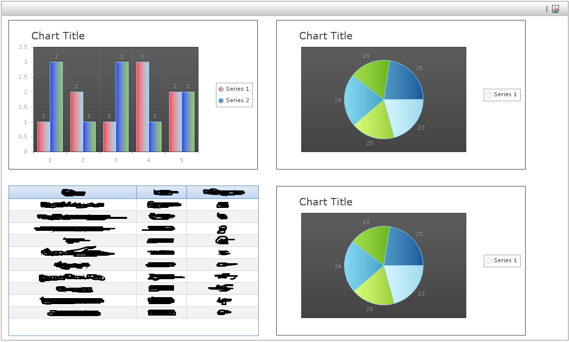 <telerik:RadGrid ID="rgTestingGrid" runat="server" OnNeedDataSource="rgTestingGrid_NeedDataSource" ShowHeader="false" Width="100%" OnItemCommand="rgTestingGrid_ItemCommand" OnItemDataBound="rgTestingGrid_ItemDataBound"> <ExportSettings ExportOnlyData="false" IgnorePaging="true" OpenInNewWindow="true"> </ExportSettings> <MasterTableView AutoGenerateColumns="false" CommandItemDisplay="Top" BorderStyle="None"> <CommandItemSettings ShowAddNewRecordButton="false" ShowExportToExcelButton="false" ShowExportToPdfButton="true" ShowExportToWordButton="false" ShowRefreshButton="false" /> <Columns> <telerik:GridTemplateColumn UniqueName="ChartCol"> <ItemTemplate> <table cellpadding="0" cellspacing="0" border="0"> <tr> <td align="left"> <telerik:RadChart ID="RadChart1" SkinsOverrideStyles="true" runat="server" Width="500"> <PlotArea> <XAxis MaxValue="5" MinValue="1" Step="1"> </XAxis> <YAxis MaxValue="3" Step="0.5" AxisMode="Extended"> </YAxis> <YAxis2 MaxValue="5" MinValue="1" Step="1"> </YAxis2> </PlotArea> <Series> <telerik:ChartSeries Name="Series 1"> <Appearance> <FillStyle MainColor="Red"> </FillStyle> </Appearance> <Items> <telerik:ChartSeriesItem YValue="1" Name="Item 1"> </telerik:ChartSeriesItem> <telerik:ChartSeriesItem YValue="2" Name="Item 2"> </telerik:ChartSeriesItem> <telerik:ChartSeriesItem YValue="1" Name="Item 3"> </telerik:ChartSeriesItem> <telerik:ChartSeriesItem YValue="3" Name="Item 4"> </telerik:ChartSeriesItem> <telerik:ChartSeriesItem YValue="2" Name="Item 5"> </telerik:ChartSeriesItem> </Items> </telerik:ChartSeries> <telerik:ChartSeries Name="Series 2"> <Appearance> <FillStyle MainColor="Blue"> </FillStyle> </Appearance> <Items> <telerik:ChartSeriesItem YValue="3" Name="Item 1"> </telerik:ChartSeriesItem> <telerik:ChartSeriesItem YValue="1" Name="Item 2"> </telerik:ChartSeriesItem> <telerik:ChartSeriesItem YValue="3" Name="Item 3"> </telerik:ChartSeriesItem> <telerik:ChartSeriesItem YValue="1" Name="Item 4"> </telerik:ChartSeriesItem> <telerik:ChartSeriesItem YValue="2" Name="Item 5"> </telerik:ChartSeriesItem> </Items> </telerik:ChartSeries> </Series> </telerik:RadChart> </td> <td align="left" style="width: 2%"> </td> <td align="left" style="width: 49%"> <telerik:RadChart ID="RadChart2" runat="server" SkinsOverrideStyles="true" Width="500px"> <PlotArea> <XAxis MaxValue="5" MinValue="1" Step="1"> </XAxis> <YAxis MaxValue="25" Step="5"> </YAxis> <YAxis2 MaxValue="5" MinValue="1" Step="1"> </YAxis2> </PlotArea> <Series> <telerik:ChartSeries Name="Series 1" Type="Pie"> <Items> <telerik:ChartSeriesItem YValue="23" Name="Item 1"> </telerik:ChartSeriesItem> <telerik:ChartSeriesItem YValue="20" Name="Item 2"> </telerik:ChartSeriesItem> <telerik:ChartSeriesItem YValue="24" Name="Item 3"> </telerik:ChartSeriesItem> <telerik:ChartSeriesItem YValue="19" Name="Item 4"> </telerik:ChartSeriesItem> <telerik:ChartSeriesItem YValue="25" Name="Item 5"> </telerik:ChartSeriesItem> </Items> </telerik:ChartSeries> </Series> </telerik:RadChart> </td> </tr> <tr> <td colspan="3"> </td> </tr> <tr> <td align="left"> <telerik:RadGrid ID="rgTenMostPopularJobs" runat="server" CssClass="RadGrid" ShowHeader="true" ShowFooter="false" GridLines="none" Skin="Office2007" Width="500" Height="300" BorderWidth="1" AutoGenerateColumns="False" ShowStatusBar="false" DataSourceID="SqlDataSource1" ClientSettings-Scrolling-AllowScroll="true"> <MasterTableView> <Columns> <telerik:GridBoundColumn DataField="JobCategory" DataType="System.String" FilterControlAltText="Filter Job Category Column" HeaderText="Category" ReadOnly="true" SortExpression="JobCategory" UniqueName="JobCategory"> <HeaderStyle VerticalAlign="Middle" HorizontalAlign="Center" /> <ItemStyle VerticalAlign="Middle" HorizontalAlign="Center" /> </telerik:GridBoundColumn> <telerik:GridBoundColumn DataField="JobIDApplied" DataType="System.Int32" FilterControlAltText="Filter Job ID Applied Column" HeaderText="Job ID" ReadOnly="true" SortExpression="JobIDApplied" UniqueName="JobIDApplied"> <HeaderStyle VerticalAlign="Middle" HorizontalAlign="Center" /> <ItemStyle VerticalAlign="Middle" HorizontalAlign="Center" /> </telerik:GridBoundColumn> <telerik:GridBoundColumn DataField="TOTAL" DataType="System.Int32" FilterControlAltText="Filter No. of Applies Column" HeaderText="No. of Applies" ReadOnly="true" SortExpression="TOTAL" UniqueName="TOTAL"> <HeaderStyle VerticalAlign="Middle" HorizontalAlign="Center" /> <ItemStyle VerticalAlign="Middle" HorizontalAlign="Center" /> </telerik:GridBoundColumn> </Columns> </MasterTableView> </telerik:RadGrid> </td> <td align="left" style="width: 2%"> </td> <td align="left" style="width: 49%"> <telerik:RadChart ID="RadChart3" runat="server" SkinsOverrideStyles="true" Width="500px"> <PlotArea> <XAxis MaxValue="5" MinValue="1" Step="1"> </XAxis> <YAxis MaxValue="25" Step="5"> </YAxis> <YAxis2 MaxValue="5" MinValue="1" Step="1"> </YAxis2> </PlotArea> <Series> <telerik:ChartSeries Name="Series 1" Type="Pie"> <Items> <telerik:ChartSeriesItem YValue="23" Name="Item 1"> </telerik:ChartSeriesItem> <telerik:ChartSeriesItem YValue="20" Name="Item 2"> </telerik:ChartSeriesItem> <telerik:ChartSeriesItem YValue="24" Name="Item 3"> </telerik:ChartSeriesItem> <telerik:ChartSeriesItem YValue="19" Name="Item 4"> </telerik:ChartSeriesItem> <telerik:ChartSeriesItem YValue="25" Name="Item 5"> </telerik:ChartSeriesItem> </Items> </telerik:ChartSeries> </Series> </telerik:RadChart> </td> </tr> </table> <asp:Image ID="Image1" runat="server" Visible="false" /> </ItemTemplate> </telerik:GridTemplateColumn> </Columns> </MasterTableView> </telerik:RadGrid>My .cs code look like this