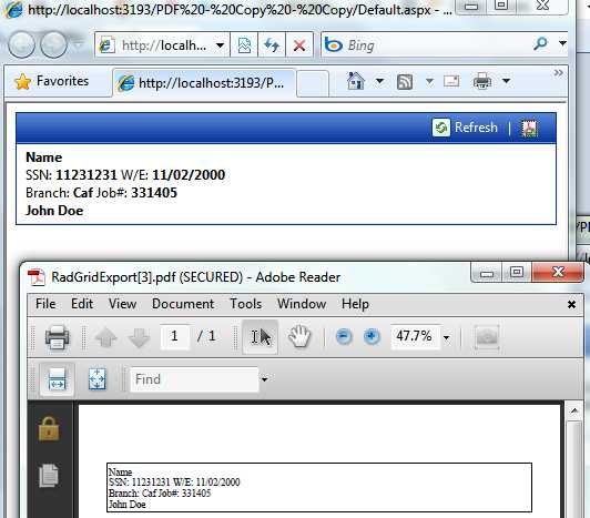 <telerik:RadGrid ID="grdReport" runat="server" AllowSorting="True" GridLines="None" AllowPaging="True" Font-Names="Arial" Font-Size="10pt" Skin="Outlook" AllowFilteringByColumn="true" PageSize="30" ShowHeader="false" EnableViewState="true" OnPreRender="grdReport_PreRender" OnNeedDataSource="grdReport_NeedDataSource" OnItemCommand="grdReport_ItemCommand" OnItemCreated="grdReport_ItemCreated"> <ExportSettings IgnorePaging="True" OpenInNewWindow="True"> <Pdf PageWidth="210mm" PageHeight="297mm" Author="VoltTrack" Creator="VoltTrack" Producer="VoltTrack" PageLeftMargin="0.5in" PageRightMargin="0.5in" /> </ExportSettings> <PagerStyle Position="Top"/> <MasterTableView CommandItemDisplay="Top" EnableViewState="true" TableLayout="Fixed"> <PagerStyle Mode="NextPrevNumericAndAdvanced" /> <CommandItemSettings ShowExportToPdfButton="True" ShowAddNewRecordButton="False" /> <ItemTemplate> <%# (((GridItem)Container).ItemIndex != 0)? "</td></tr></table>" : "" %> <asp:Panel ID="ItemContainer" CssClass='<%# (((GridItem)Container).ItemType == GridItemType.Item)? "item" : "alternatingItem" %>' runat="server"> <b><%# Eval("C_Name")%></b> <br /> SSN: <b><%# Eval("SSN")%></b> W/E: <b><%# Eval("Weekend_Date")%></b> <br /> Branch: <b><%# Eval("Branch")%></b> Job#: <b><%# Eval("Job_Number")%></b> <br /> <b><%# Eval("Cust_Name")%></b> </asp:Panel> </ItemTemplate> </MasterTableView> <HeaderStyle HorizontalAlign="Center" /> <ClientSettings AllowColumnsReorder="True" ReorderColumnsOnClient="True"> <Scrolling EnableVirtualScrollPaging="True" /> </ClientSettings> </telerik:RadGrid>protected void grdReport_PreRender(object sender, EventArgs e) { int itemCount = (sender as RadGrid).MasterTableView.GetItems(GridItemType.Item).Length + (sender as RadGrid).MasterTableView.GetItems(GridItemType.AlternatingItem).Length; foreach (GridItem item in (sender as RadGrid).Items) { if (item is GridDataItem && item.ItemIndex < itemCount - 1) { ((item as GridDataItem)["C_Name"] as TableCell).Controls.Add(new LiteralControl("<table style='display:none;width: 730px'><colgroup><col /><col /><col /></colgroup><tr><td>")); } } }Can you please help?