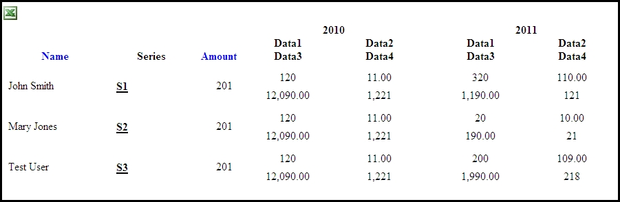 <%@ Page Language="C#" AutoEventWireup="true" CodeBehind="ScaleAnalysisTemplateTest.aspx.cs" Inherits="DSSAnalytics.DashboardWidgets.ScaleAnalysisTool.ScaleAnalysisTemplateTest" %><%@ Register Assembly="Telerik.Web.UI" Namespace="Telerik.Web.UI" TagPrefix="telerik" %><!DOCTYPE html PUBLIC "-//W3C//DTD XHTML 1.0 Transitional//EN" "http://www.w3.org/TR/xhtml1/DTD/xhtml1-transitional.dtd"><html xmlns="http://www.w3.org/1999/xhtml"><head runat="server"> <title></title></head><body> <form id="form1" runat="server"> <telerik:RadScriptManager ID="MuniWebScriptMgr" runat="server" EnablePartialRendering="true" AsyncPostBackTimeout="36000"> <Scripts> <asp:ScriptReference Path="~/scripts/jquery-1.3.2.js" /> </Scripts> </telerik:RadScriptManager> <asp:ImageButton runat="server" ID="IMG_Excel" OnClick="DownloadAsExcel" CssClass="ExcelBtnStyle" ImageUrl="../../images/excel.png" ToolTip="Export to Excel" /> <div id="gridCtrl" runat="server"> </div> </form></body></html> RadGrid r; protected void Page_Init(object sender, EventArgs e) { BuildRadGrid(); } protected void Page_Load(object sender, EventArgs e) { } private void BuildRadGrid() { r = new RadGrid(); r.ID = "ScaleAnalysisSummaryByRow"; r.GridLines = GridLines.None; r.EnableEmbeddedSkins = false; r.MasterTableView.AutoGenerateColumns = false; r.MasterTableView.TableLayout = GridTableLayout.Fixed; r.AllowSorting = true; r.MasterTableView.AllowNaturalSort = true; r.ClientSettings.Scrolling.SaveScrollPosition = false; r.EnableViewState = false; r.Height = Unit.Pixel(450); r.Width = Unit.Pixel(1200); r.MasterTableView.Width = Unit.Pixel(900); GridBoundColumn boundColumn1 = new GridBoundColumn(); boundColumn1.HeaderText = "Name"; boundColumn1.DataField = "name"; boundColumn1.UniqueName = "name"; boundColumn1.HeaderStyle.HorizontalAlign = HorizontalAlign.Center; boundColumn1.ItemStyle.HorizontalAlign = HorizontalAlign.Left; boundColumn1.HeaderStyle.VerticalAlign = VerticalAlign.Bottom; boundColumn1.HeaderStyle.Width = Unit.Pixel(150); boundColumn1.HeaderStyle.Font.Bold = true; r.Columns.Add(boundColumn1); GridTemplateColumn boundColumn2 = new GridTemplateColumn(); boundColumn2.HeaderText = "Series"; boundColumn2.ItemTemplate = new ScaleAnalysisRowSeriesNameTemplate(); boundColumn2.HeaderStyle.HorizontalAlign = HorizontalAlign.Center; boundColumn2.ItemStyle.HorizontalAlign = HorizontalAlign.Left; boundColumn2.HeaderStyle.VerticalAlign = VerticalAlign.Bottom; boundColumn2.HeaderStyle.Width = Unit.Pixel(130); boundColumn2.HeaderStyle.Font.Bold = true; r.Columns.Add(boundColumn2); GridBoundColumn boundColumn3 = new GridBoundColumn(); boundColumn3.HeaderText = "Amount"; boundColumn3.DataField = "amt"; boundColumn3.UniqueName = "amt"; boundColumn3.HeaderStyle.HorizontalAlign = HorizontalAlign.Center; boundColumn3.ItemStyle.HorizontalAlign = HorizontalAlign.Right; boundColumn3.HeaderStyle.VerticalAlign = VerticalAlign.Bottom; boundColumn3.HeaderStyle.Width = Unit.Pixel(60); boundColumn3.HeaderStyle.Font.Bold = true; boundColumn3.DataFormatString = "{0:N0}"; r.Columns.Add(boundColumn3); int year = 2010; string col1 = "col1_d1"; string col2 = "col1_d2"; string col3 = "col1_d3"; string col4 = "col1_d4"; GridTemplateColumn templateColumn = new GridTemplateColumn(); templateColumn.HeaderTemplate = new ScaleAnalysisRowHeaderTemplate(year); templateColumn.ItemTemplate = new ScaleAnalysisRowItemTemplate(col1 , col2, col3 , col4); r.Columns.Add(templateColumn); year = 2011; col1 = "col2_d1"; col2 = "col2_d2"; col3 = "col2_d3"; col4 = "col2_d4"; GridTemplateColumn templateColumn2 = new GridTemplateColumn(); templateColumn2.HeaderTemplate = new ScaleAnalysisRowHeaderTemplate(year); templateColumn2.ItemTemplate = new ScaleAnalysisRowItemTemplate(col1, col2, col3, col4); r.Columns.Add(templateColumn2); r.ClientSettings.Scrolling.AllowScroll = true; r.ClientSettings.Scrolling.UseStaticHeaders = true; r.ClientSettings.Selecting.AllowRowSelect = true; r.NeedDataSource += new GridNeedDataSourceEventHandler(Grid_NeedDataSource); gridCtrl.Controls.Add(r); } protected void Grid_NeedDataSource(object source, Telerik.Web.UI.GridNeedDataSourceEventArgs e) { DataTable dt = new DataTable(); dt.Columns.Add("name", typeof(String)); dt.Columns.Add("series", typeof(String)); dt.Columns.Add("amt", typeof(Decimal)); dt.Columns.Add("col1_d1", typeof(Decimal)); dt.Columns.Add("col1_d2", typeof(Decimal)); dt.Columns.Add("col1_d3", typeof(Decimal)); dt.Columns.Add("col1_d4", typeof(Decimal)); dt.Columns.Add("col2_d1", typeof(Decimal)); dt.Columns.Add("col2_d2", typeof(Decimal)); dt.Columns.Add("col2_d3", typeof(Decimal)); dt.Columns.Add("col2_d4", typeof(Decimal)); DataRow dr = dt.NewRow(); dr["name"] = "John Smith"; dr["series"] = "S1"; dr["amt"] = 200.98; dr["col1_d1"] = 120; dr["col1_d2"] = 11; dr["col1_d3"] = 12090; dr["col1_d4"] = 1221; dr["col2_d1"] = 320; dr["col2_d2"] = 110; dr["col2_d3"] = 1190; dr["col2_d4"] = 121; dt.Rows.Add(dr); dr = dt.NewRow(); dr["name"] = "Mary Jones"; dr["series"] = "S2"; dr["amt"] = 200.98; dr["col1_d1"] = 120; dr["col1_d2"] = 11; dr["col1_d3"] = 12090; dr["col1_d4"] = 1221; dr["col2_d1"] = 20; dr["col2_d2"] = 10; dr["col2_d3"] = 190; dr["col2_d4"] = 21; dt.Rows.Add(dr); dr = dt.NewRow(); dr["name"] = "Test User"; dr["series"] = "S3"; dr["amt"] = 200.98; dr["col1_d1"] = 120; dr["col1_d2"] = 11; dr["col1_d3"] = 12090; dr["col1_d4"] = 1221; dr["col2_d1"] = 200; dr["col2_d2"] = 109; dr["col2_d3"] = 1990; dr["col2_d4"] = 218; dt.Rows.Add(dr); RadGrid grid = (RadGrid)source; grid.DataSource = dt; } protected void DownloadAsExcel(object sender, EventArgs e) { try { r.ExportSettings.IgnorePaging = true; r.ExportSettings.OpenInNewWindow = true; r.ExportSettings.ExportOnlyData = true; r.ExportSettings.FileName = "ExcelSample"; r.MasterTableView.ExportToExcel(); } catch (Exception ex) { throw ex; } }}internal class ScaleAnalysisRowSeriesNameTemplate : ITemplate{ protected LiteralControl securityWindow; public ScaleAnalysisRowSeriesNameTemplate() { } public void Instant