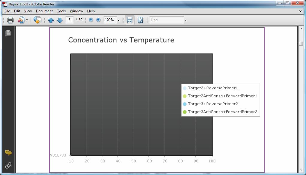 Private Sub LoadChart(ByVal sFileName As String, ByRef sChart As Telerik.Reporting.Chart) Dim inFile As StreamReader = File.OpenText(sFileName) Try Dim j As Integer Dim sLine As String Dim sValues() As String Dim chartSeries() As Telerik.Reporting.Charting.ChartSeries Dim bFirstLoad As Boolean = False Dim yMax, yMin As Double Do While inFile.Peek <> -1 sLine = inFile.ReadLine sValues = Split(sLine, vbTab) If UCase(Trim(sValues(0))) = "TEMPERATURE" Then 'Create an array of Series for length of value 'Create Chart Series Names For j = 0 To sValues.Length - 1 ReDim Preserve chartSeries(j) chartSeries(j) = New Telerik.Reporting.Charting.ChartSeries If j > 0 Then If sValues(j) <> "" Then chartSeries(j).Name = sValues(j) chartSeries(j).Type = Charting.ChartSeriesType.Line chartSeries(j).Appearance.PointMark.Dimensions.Width = 1 chartSeries(j).Appearance.PointMark.Dimensions.Height = 1 chartSeries(j).Appearance.PointMark.FillStyle.MainColor = chartSeries(j).Appearance.LineSeriesAppearance.Color chartSeries(j).Appearance.PointMark.Visible = True chartSeries(j).DefaultLabelValue = "" chartSeries(j).YAxisType = Charting.ChartYAxisType.Primary End If End If Next ElseIf IsNumeric(sValues(0)) Then For j = 0 To sValues.Length - 1 If sValues(j) <> "" Then If j > 0 Then If bFirstLoad = False Then If yMax = 0 Then yMax = CDbl(sValues(j)) End If If yMin = 0 Then yMin = CDbl(sValues(j)) End If bFirstLoad = True End If 'Add the values to the chart series chartSeries(j).AddItem(CDbl(sValues(j))) chartSeries(j).Item(chartSeries(j).Items.Count - 1).XValue = CDbl(sValues(0)) chartSeries(j).Item(chartSeries(j).Items.Count - 1).YValue = CDbl(sValues(j)) chartSeries(j).Item(chartSeries(j).Items.Count - 1).ActiveRegion.Tooltip = CDbl(sValues(j)) 'Update Min and Max Values If yMin > CDbl(sValues(j)) Then yMin = CDbl(sValues(j)) End If If yMax < CDbl(sValues(j)) Then yMax = CDbl(sValues(j)) End If End If End If Next End If Loop For j = 0 To chartSeries.Length - 1 If j > 0 Then sChart.Series.Add(chartSeries(j)) End If Next sChart.PlotArea.XAxis.AxisLabel.TextBlock.Text = "Temperature" sChart.PlotArea.XAxis.AxisLabel.TextBlock.Appearance.TextProperties.Color = Color.Black sChart.PlotArea.XAxis.Appearance.Visible = Charting.Styles.ChartAxisVisibility.True sChart.PlotArea.XAxis.VisibleValues = Charting.Styles.ChartAxisVisibleValues.All sChart.PlotArea.XAxis.Appearance.Width = 3 sChart.PlotArea.XAxis.MinValue = 10 sChart.PlotArea.XAxis.MaxValue = 100 sChart.PlotArea.XAxis.LabelStep = 10 sChart.PlotArea.XAxis.MaxItemsCount = 100 + 1 sChart.PlotArea.XAxis.AutoScale = False sChart.PlotArea.YAxis.AxisLabel.TextBlock.Text = "Concentration" sChart.PlotArea.YAxis.AxisLabel.TextBlock.Appearance.TextProperties.Color = Color.Black sChart.PlotArea.YAxis.Appearance.Visible = Charting.Styles.ChartAxisVisibility.True sChart.PlotArea.YAxis.Appearance.Width = 3 sChart.PlotArea.YAxis.IsZeroBased = False sChart.PlotArea.YAxis.VisibleValues = Charting.Styles.ChartAxisVisibleValues.All sChart.PlotArea.YAxis.MaxValue = yMax sChart.PlotArea.YAxis.MinValue = yMin sChart.PlotArea.YAxis.AutoScale = False sChart.ChartTitle.TextBlock.Text = "Concentration vs Temperature" Catch ex As Exception VOMsgBox(ex.ToString) Finally inFile.Close() inFile = Nothing End Try End SubAny Idea on why it doesn't display when exported?