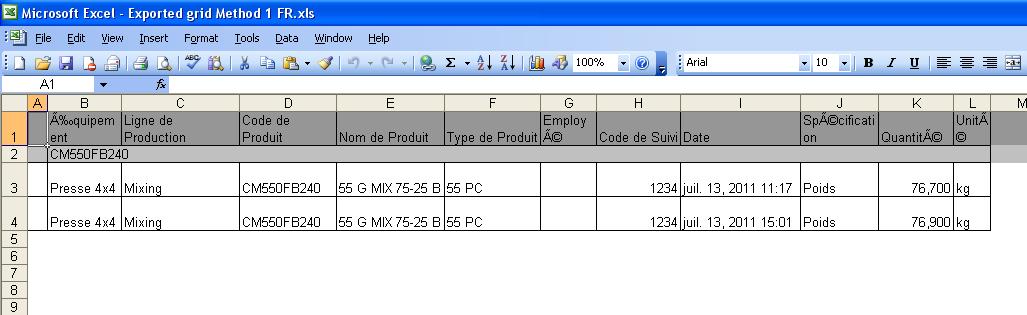 When im using French Canadian localization ("fr-CA"), im always getting weird characters for "special" letters (like "é", etc.) For instance the word "Équipement" becomes "Équipement". I also noted that when using {0:N4} as DataFormatString for particular numeric type columns (ex: 7,68), the export gives 76,80. Im forced to use default DataFormatString which use "." instead of "," but I lose the 4 digits limit.