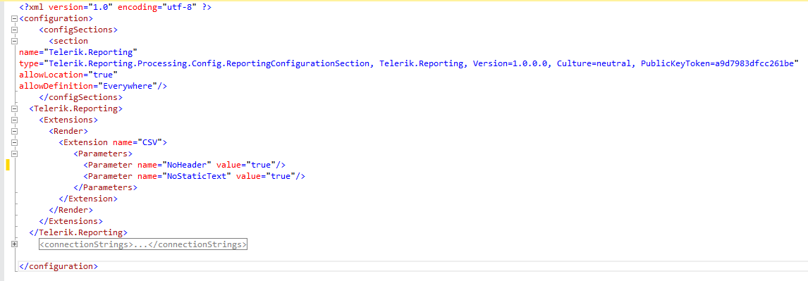 <configuration> <configSections> <section name="Telerik.Reporting" type="Telerik.Reporting.Configuration.ReportingConfigurationSection, Telerik.Reporting, Version=8.2.14.1107, Culture=neutral, PublicKeyToken=a9d7983dfcc261be" allowLocation="true" allowDefinition="Everywhere"/> </configSections> … <Telerik.Reporting> <Extensions> <Render> <Extension name="CSV" > <Parameters> <Parameter name="NoHeader" value="true"/> <Parameter name="NoStaticText" value="true"/> </Parameters> </Extension> </Render> </Extensions> </Telerik.Reporting> ...</configuration>If you are going to use the ReportProcessor to export the report, you can directly pass the settings by key.