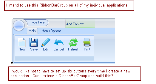 Technically, you can extend the RadRibbonBarGroup and fill its Items collection with six buttons. However, the efficiency of this approach is controversial. A ribbon group is not a standalone component and, therefore, once inherited, it can no longer be used at design-time. In other words you will need to add the group manually at run-time.