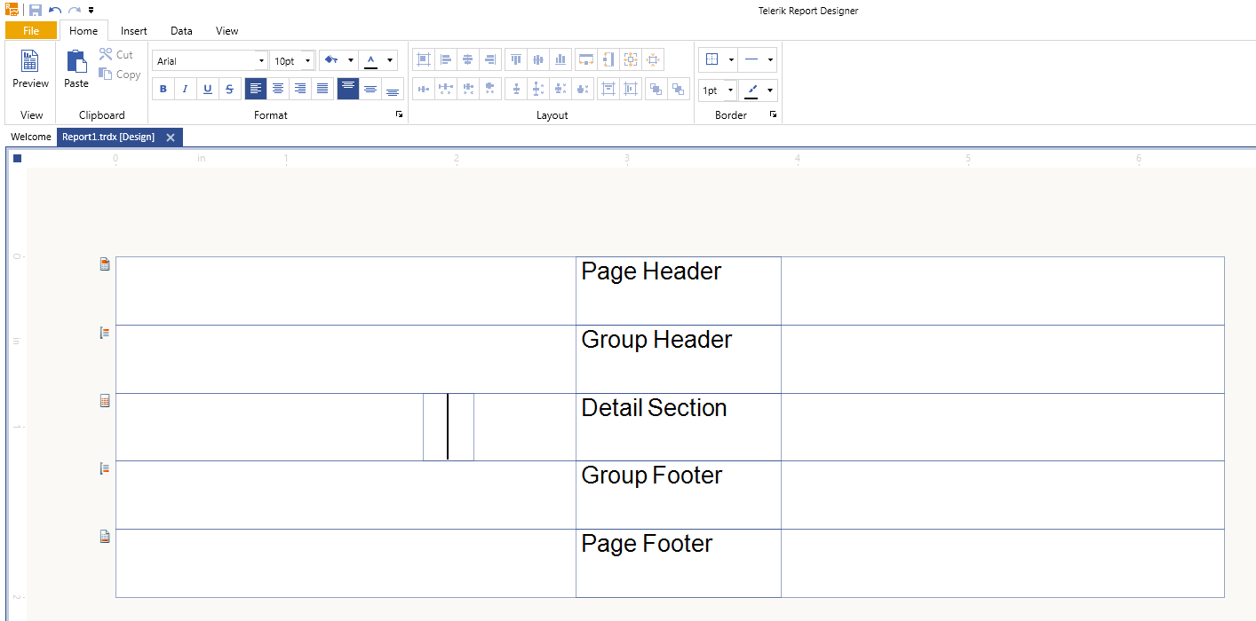 The challenge is to create vertical lines in the details section to separate the fields of information visually. I wish these to extend all the way down from the top of the "Detail" section to the top of the "Footer" section.