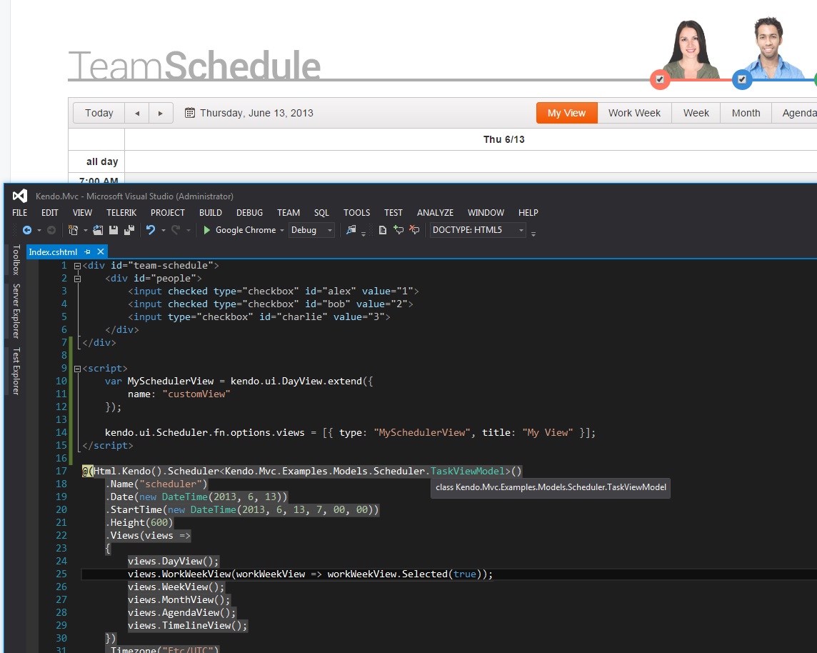 <script> var MySchedulerView = kendo.ui.DayView.extend({ name: "customView" }); kendo.ui.Scheduler.fn.options.views = [{ type: "MySchedulerView", title: "My View" }];</script>@(Html.Kendo().Scheduler<TaskViewModel>() .Name("scheduler") //.....)Regards,