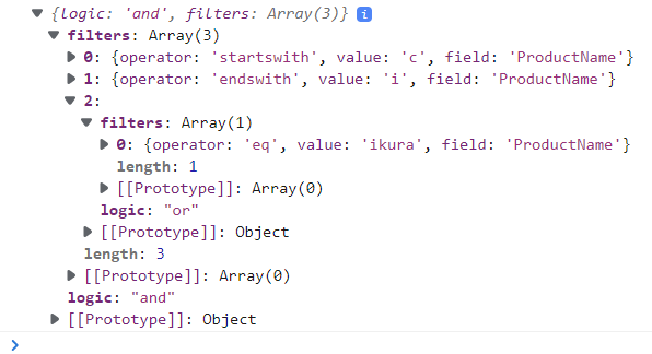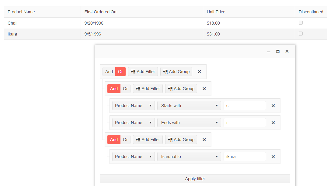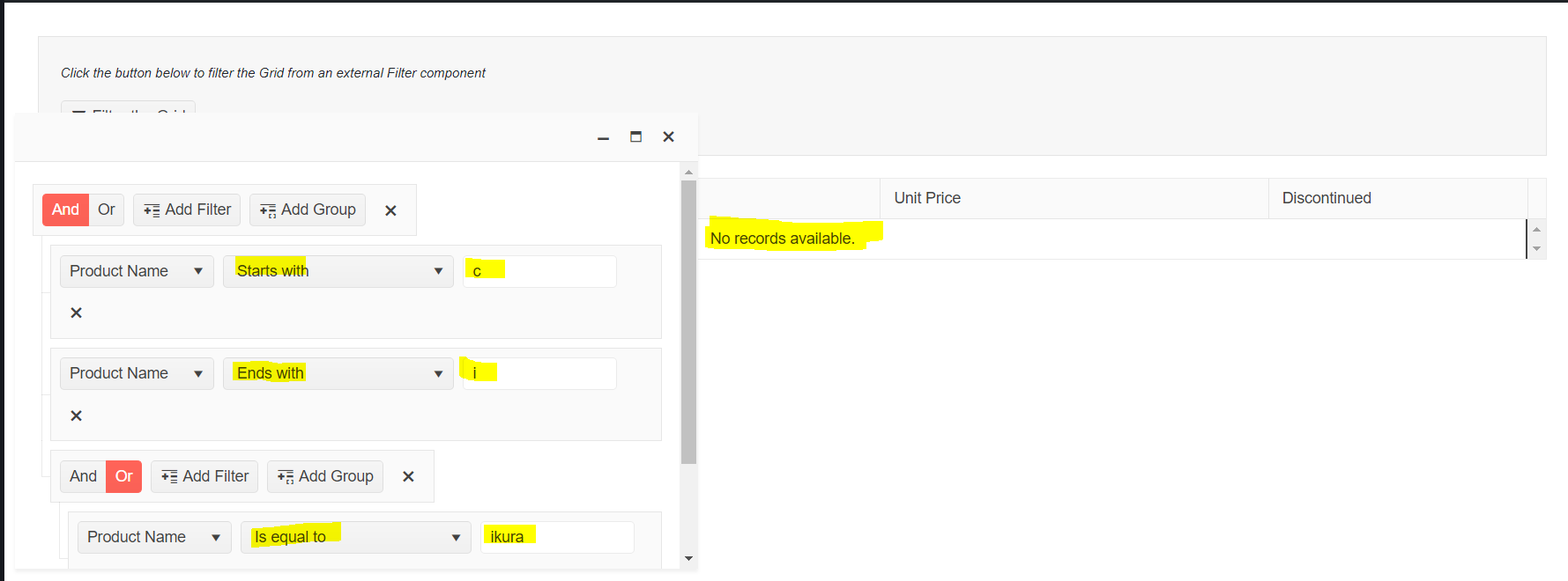 (Product Name starts with 'c' And Product Name ends with 'i') OR Product Name is equal to 'Ikura'