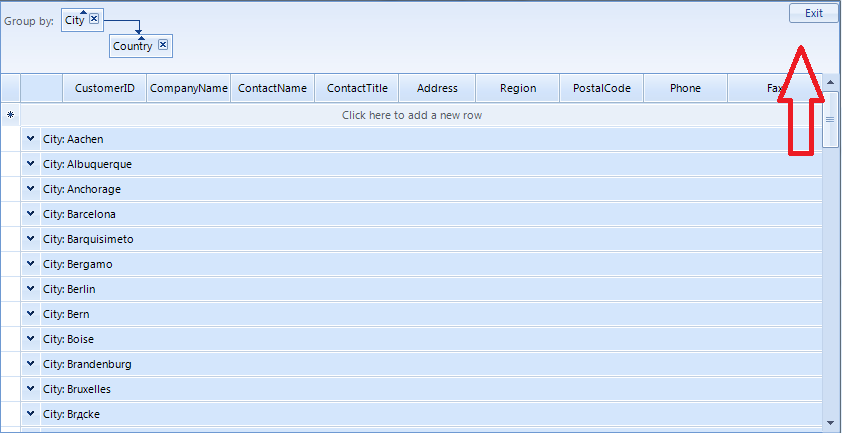 public Form1(){ InitializeComponent(); RadButtonElement exitButton = new RadButtonElement(); exitButton.Text = "Exit"; exitButton.MaxSize = new System.Drawing.Size(50, 20); exitButton.Click+=exitButton_Click; exitButton.Alignment = ContentAlignment.TopRight; this.radGridView1.GridViewElement.GroupPanelElement.Children.First().Children.First().Children.Add(exitButton); }I hope this information helps. Should you have further questions, I would be glad to help.
