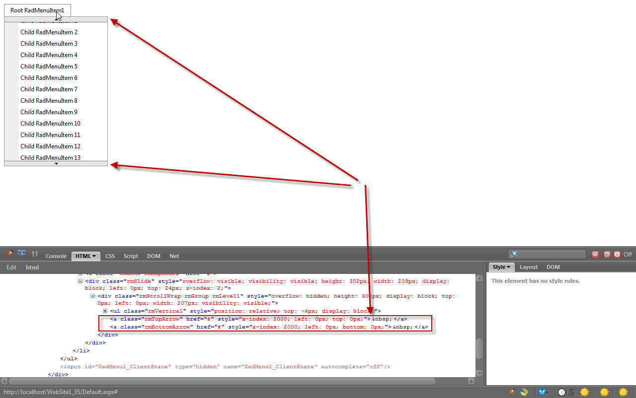 Note that if you increase the number of RadMenuItems beyond the length of the context menu, the up/down scroll arrows appear. It is just when the number of menu items does not fully fill the context menu that the displays below the last menu item.